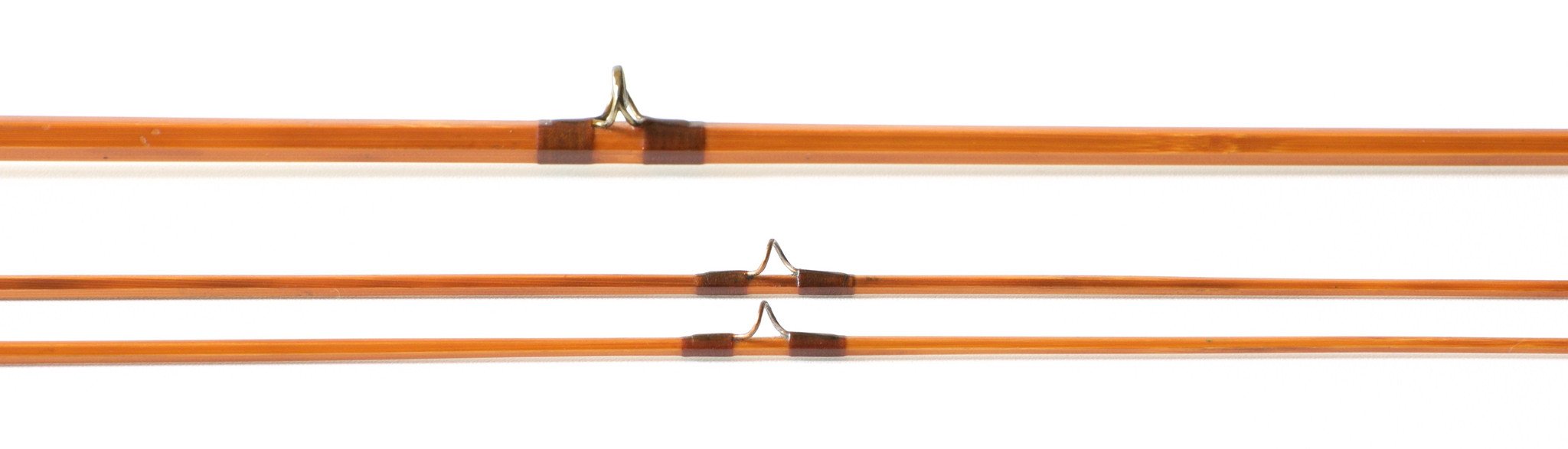 For sale here we have a rather scarce FE Thomas Browntone Special -- 7' 2/2 4wt bamboo rod. Serial no. F32 - made in 1945. The rod is in excellent original condition. All sections are full length and straight. The rod features caramel colored browntone cane with rich chestnut brown colored wraps. Three band tipping at the male ferrules, also a 3-7-3-1 banding pattern on the generously swelled butt. The varnish on the rod is in excellent condition save a few very small chips here and there. The original owner's name was printed on the rod at the factory, a feature not often seen. Ring hook keeper attached to winding check. Blued hardware throughout. Bronzed guides. The modified full wells grip is quite curvy and fits the hand very well. The grip is in excellent condition with no ridging, though soiled. Cap and ring reel seat with mortised cork spacer. Ferrules are size 10/64, the fit is nice and tight as it should be. The rod weighs 3.20 oz. The action is a solid 4wt. The swelled butt gives the rod a quick and responsive action on the faster side of medium-fast with a delicate tip. This rod would excel on most trout streams as a deadly dry-fly rod, though not limited to this approach. Includes original green rod bag free of tears or rips and original tube with brass fittings. A truly exceptional example of a short FE Thomas rod.