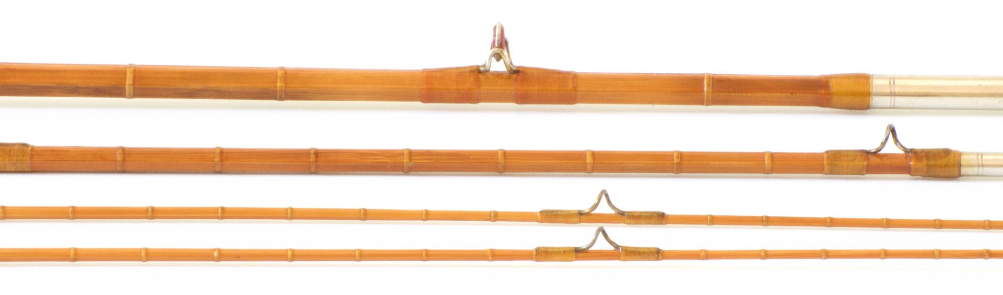 For sale here is a FE Thomas Dirigo Bamboo Rod 8' 3/2 for a 3-4 weight line. Serial #7 on the butt cap dating the rod to 1917. Gold silks with full intermediates. Agate stripping guide. Cigar grip with slight ridging. Nickel silver sliding band reel seat. Ferrule sizes 14/64 and 9/64 with witness marks and a great fit. The rod has a classic medium-action that is very smooth. Nearly all of the wraps are original. There may have been an thin overcoat of varnish applied at some point in the rod's life. No repairs are evident however. Comes in original heavy canvas bag and bamboo tip tube with brass fittings. This is a wonderful fly rod from the golden age of bamboo that is sure not to disappoint.
