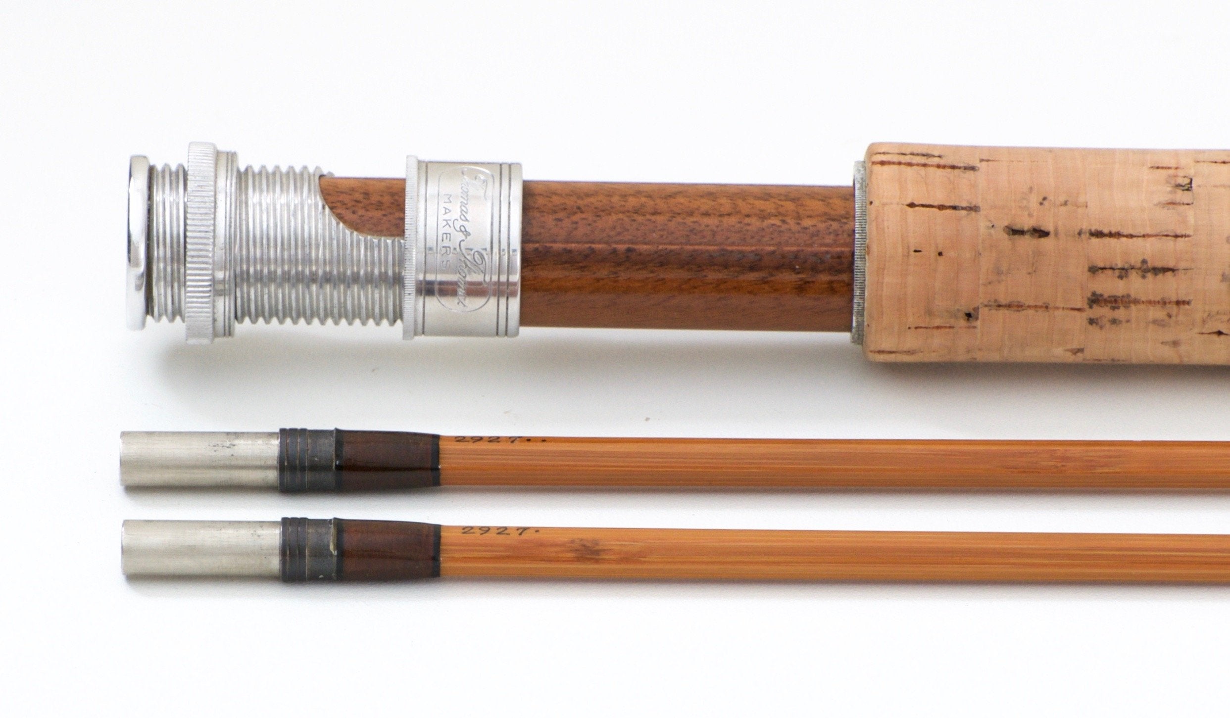 For sale here is a gorgeous Thomas & Thomas "Midge" bamboo rod -- 8' 2/2 for a 5 weight line. Serial no. 2927 which dates the rod to 1976-1977. This is one of the hard to find varnished rods with polished aluminum tube -- the best of the best of the rods coming from T&T featured both. Rod is in excellent+ condition having been fished sparingly. All sections are full length and straight. Brilliantly crafted swelled butt section and blued hardware. The rod features one and two dots at the tip section ferrules to distinguish one from another. The cigar grip is 6 1/4" long with only light soiling and handling marks. Up-locking reel seat with engraved sliding ring over a mortised walnut spacer. The step-down Swiss-style ferrules are size 14/64 with an excellent fit. The last owner had Dave Kenney make a ferrule plug which is an added bonus. The rod weighs 4 1/2 oz. Terrific, smooth medium-fast action with plenty of power from the swelled butt and fine tips to allow for finesse and tippet protection. A wonderful trout rod. Includes original cloth bag with stiffener and unlabeled highly polished aluminum tube in amazing condition itself.