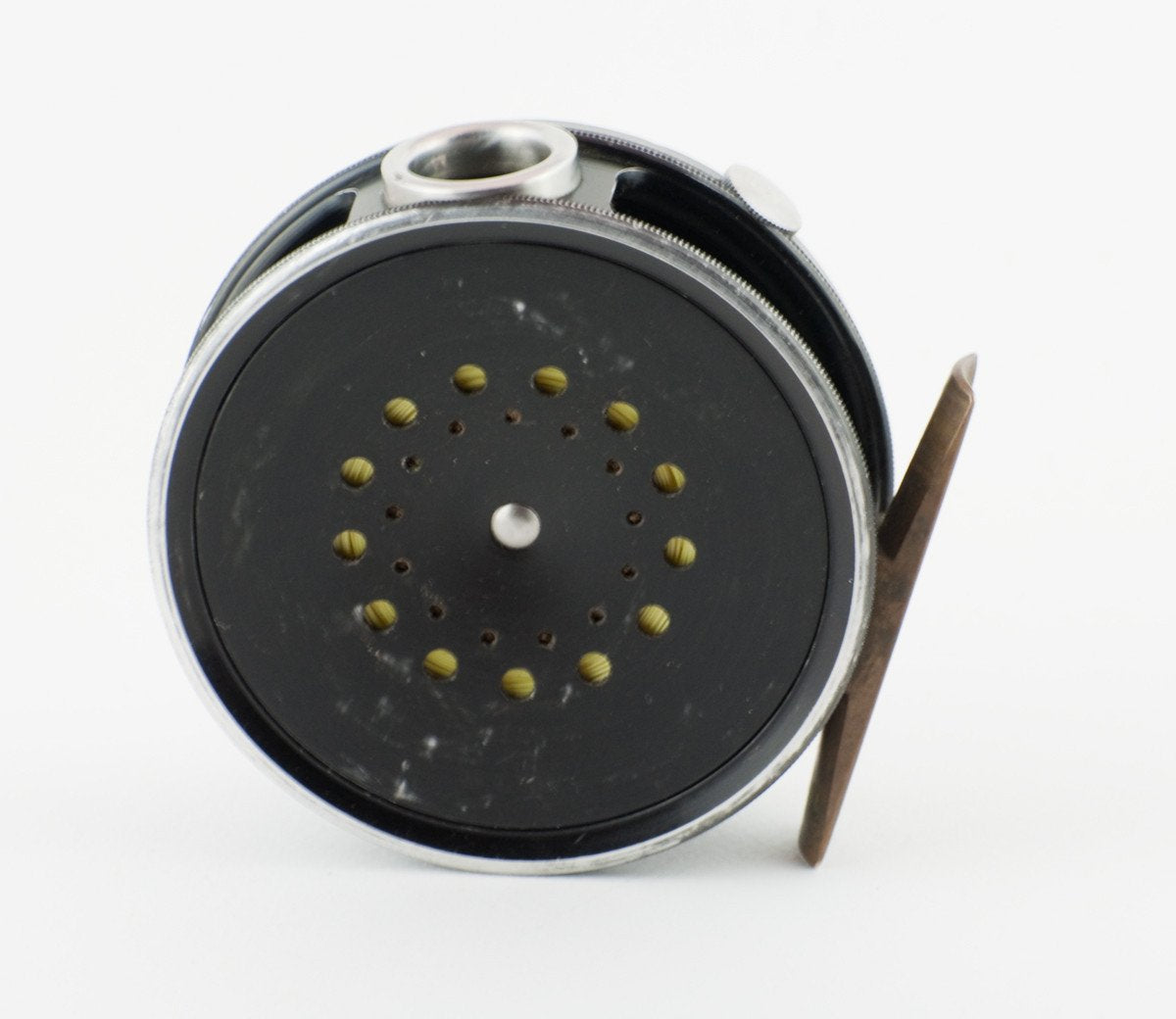 From Dan Homel's book, Antique Fly Reels, A History and Value Guide , "The drag incorporates a separate brake shoe for tension and pawl for click, both mounted upon lever arms fitted to opposite sides of a brake drum. The brake drum is provided with a smooth surface to accommodate the shoe and a toothed area or ratchet for the click pawl. Overall tension can be adjusted in various combinations between the pawl and brake shoe by means of two individual knobs which each drive a spring loaded stem against their respective lever arm. A recessed roller cage houses loosely fitted ball bearings to ease the entire rotation process."