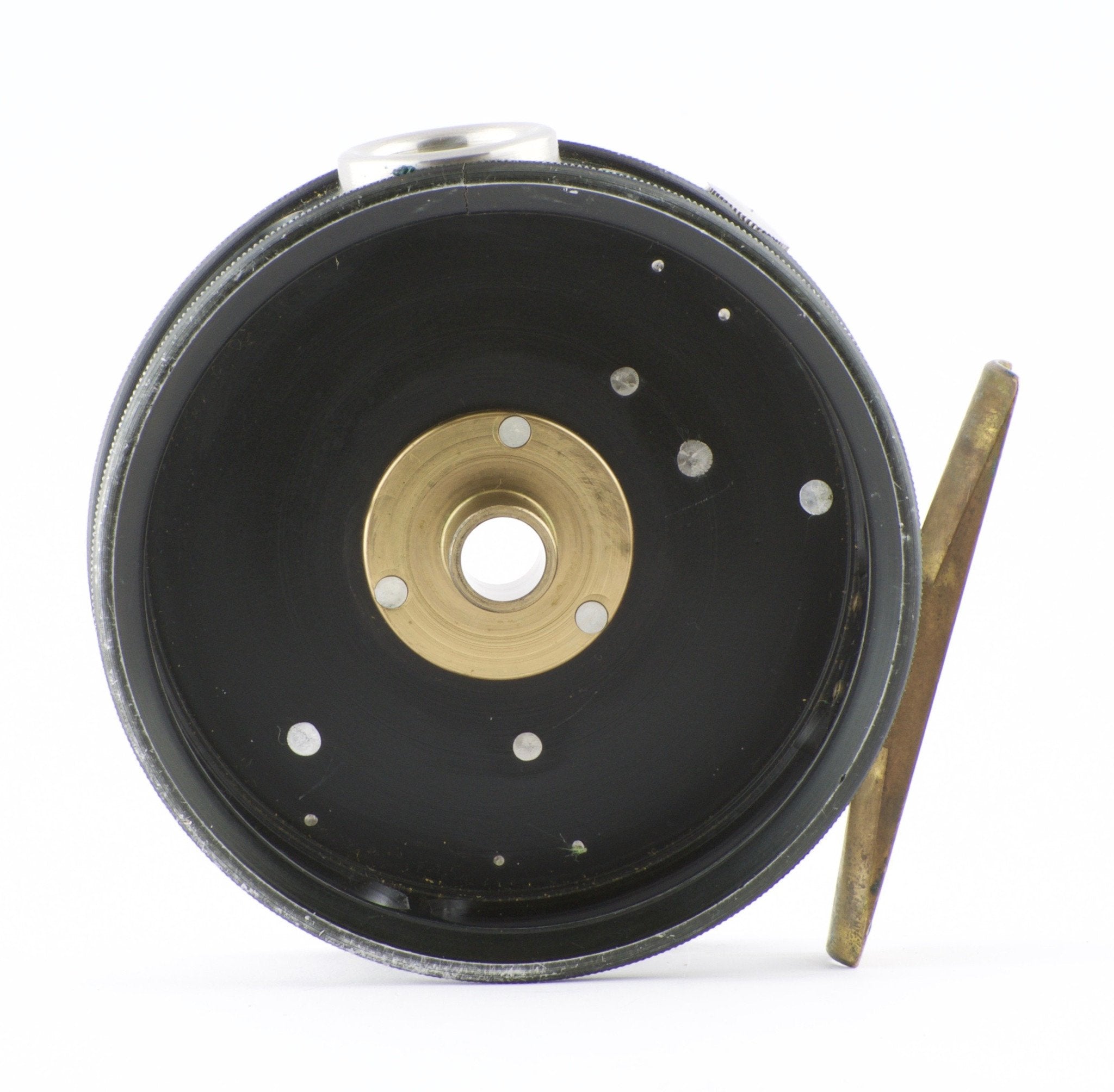 From Dan Homel's book, Antique Fly Reels, A History and Value Guide , "The drag incorporates a separate brake shoe for tension and pawl for click, both mounted upon lever arms fitted to opposite sides of a brake drum. The brake drum is provided with a smooth surface to accommodate the shoe and a toothed area or ratchet for the click pawl. Overall tension can be adjusted in various combinations between the pawl and brake shoe by means of two individual knobs which each drive a spring loaded stem against their respective lever arm. A recessed roller cage houses loosely fitted ball bearings to ease the entire rotation process."