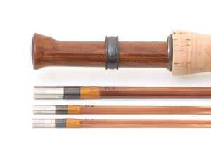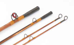 The rod features moderately flame tempered cane with gold silks and deeply oxidized guides. Ruby colored agate stripping guide. The script remains as clean and bold as the day it was written. The full-wells grip measures 6" in length. Simple and classic up-locking oxidized nickel silver cap and ring reel seat over a fine mortised koa spacer. The oxidized Swiss-style ferrules are size 9/64 and 14/64 with a perfect fit. The rod weighs 3.75 oz. Medium-fast action. Includes original bag with hang-tag and labeled tube.