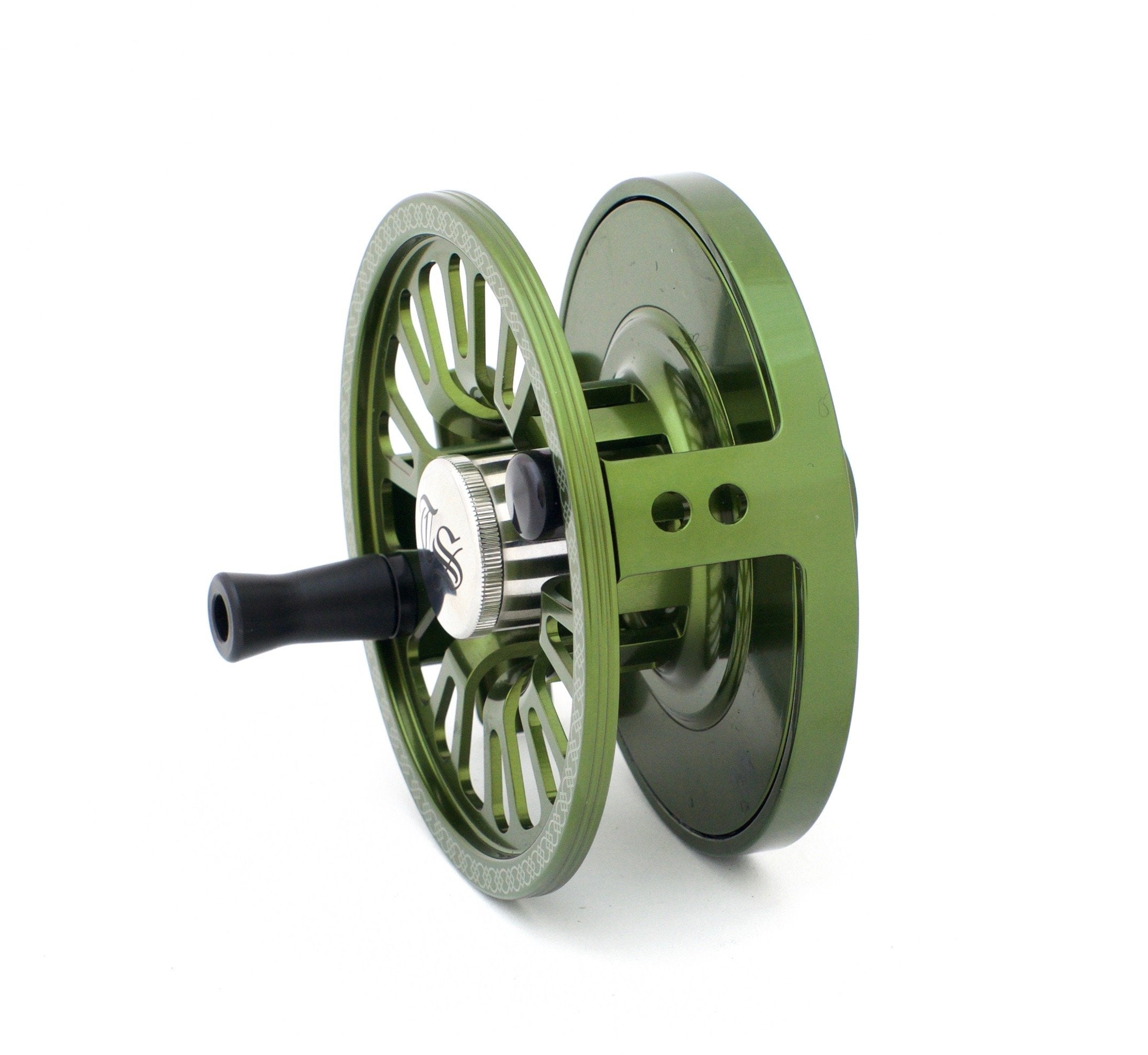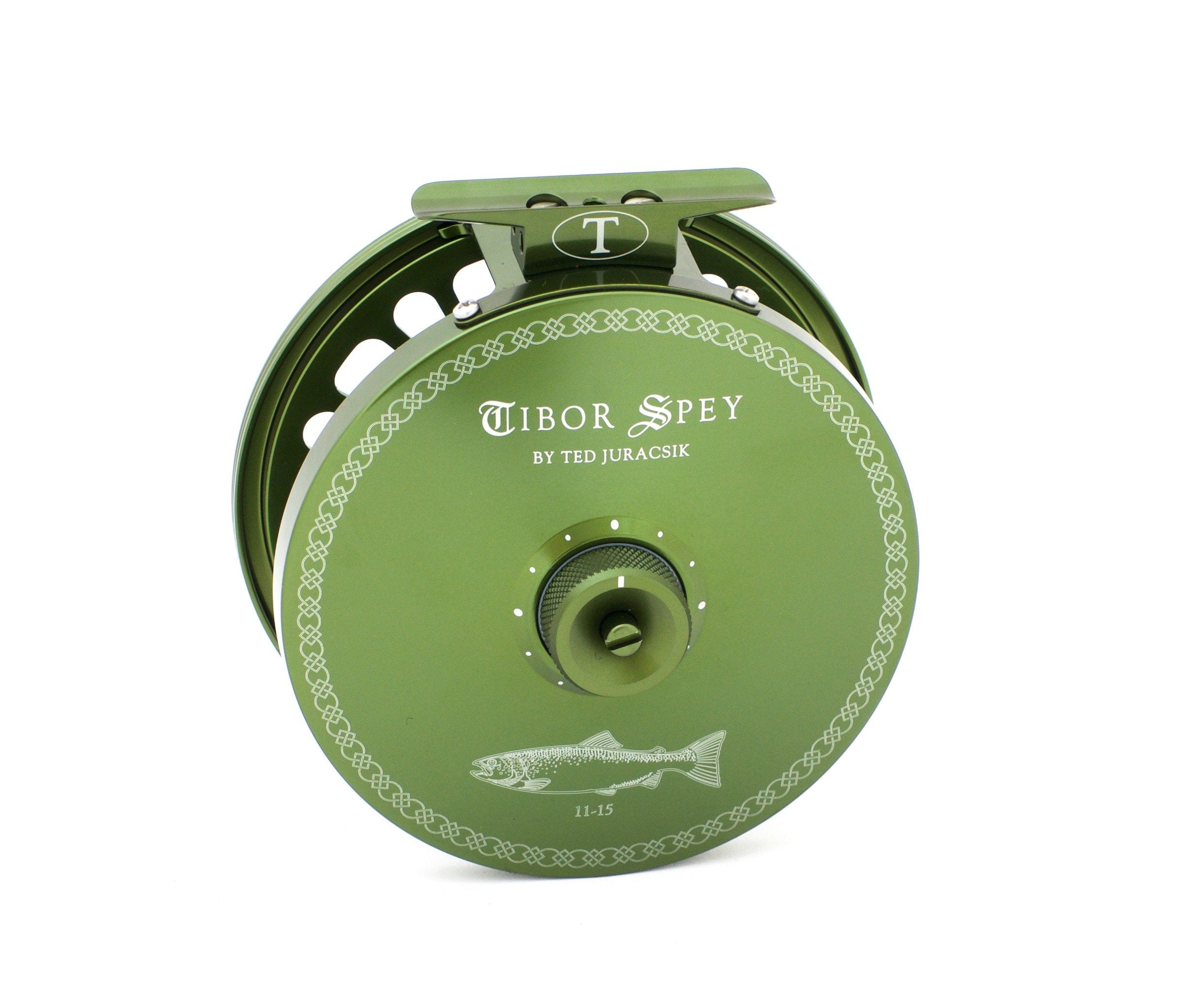 For sale here is a Tibor Spey 11-15 fly reel. The reel is in mint condition. Serial no. TS051. Made from bar stock aluminum. The reel is right hand retrieve only. The Tibor Spey reels feature a modified sealed drag system with a drag knob outlined in "witness marks." These marks allow you to precisely set, loosen, keep track of and then reset your drag for the various tippet tensions required while striking, fighting and delicately landing larger fish. The drag remains one of the strongest in the industry. The Tibor Spey also features a quick change spool for changing the spool at a moments notice without tools or complicated parts. Simply unscrew the knob and change the spool. Finished in a non-reflective anodized moss green with Celtic designs that pay homage to the Spey style of fishing. The reel is precisely weighted and balanced for the heavier lines and rods used in this classic form of fishing. Like every Tibor product, it's made and assembled in the USA and virtually maintenance-free.
