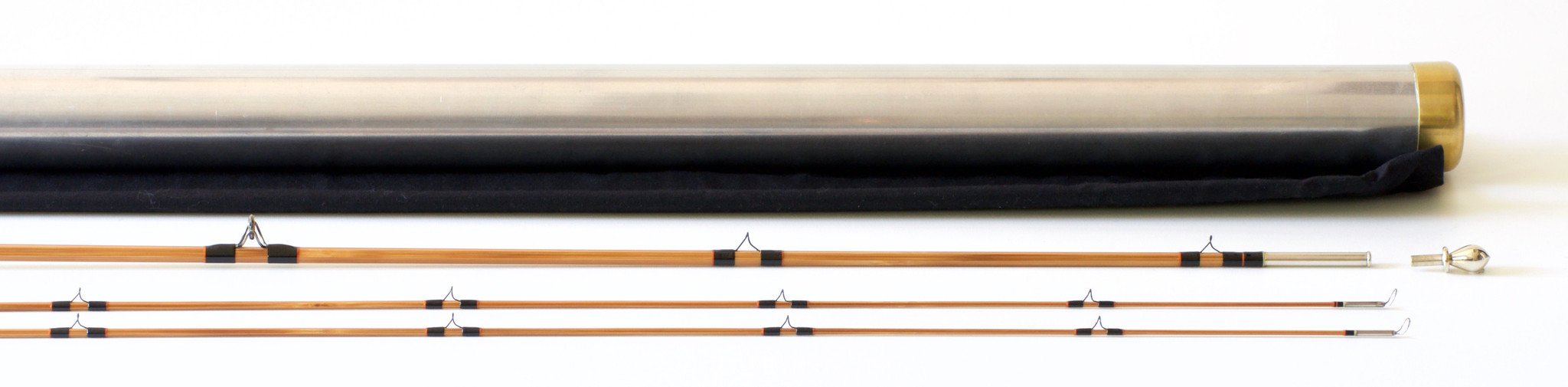For sale here is another fine rod from the team of Amelia Tufts and Gabe Batson, a 7' 2/2 4wt bamboo rod in near mint condition. Serial no. 1504. This rod has medium-light blonde cane, beautiful caramel colored agate stripper, oxidized guides, bright nickel-silver hardware, and a cap and ring reel seat over a stunning mortised African Blackwood spacer. Medium dry-fly action with a slight swell at the butt. Feels balanced, light and controlled with plenty of reserve power. Black silk wraps tipped amber. Cigar grip with only the slightest soiling. The butt cap is engraved "Tufts and Batson 1504". The ferrules are size 11/64. The fit is excellent. Rod includes fine nickel silver ferrule plug. The rod weighs 3 1/8 oz. Includes original bag and original aluminum tube with brass fittings and Tufts & Batson label.
