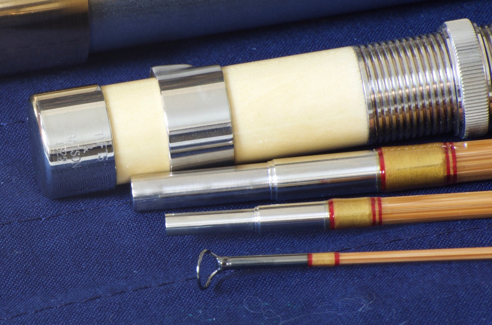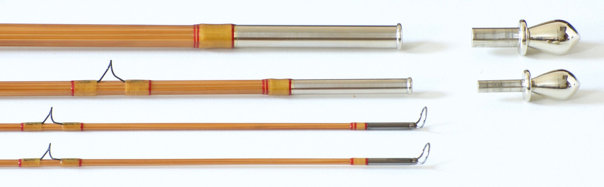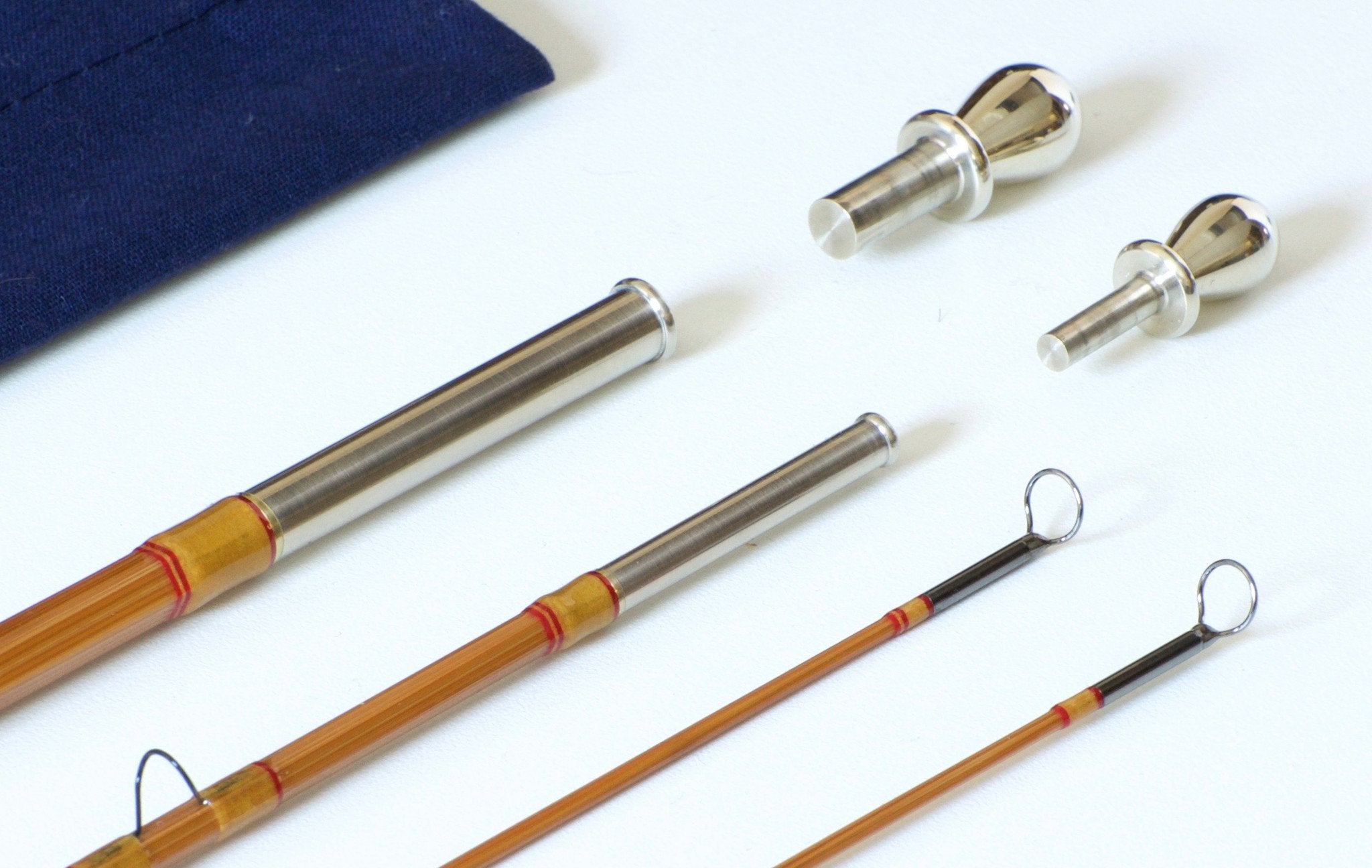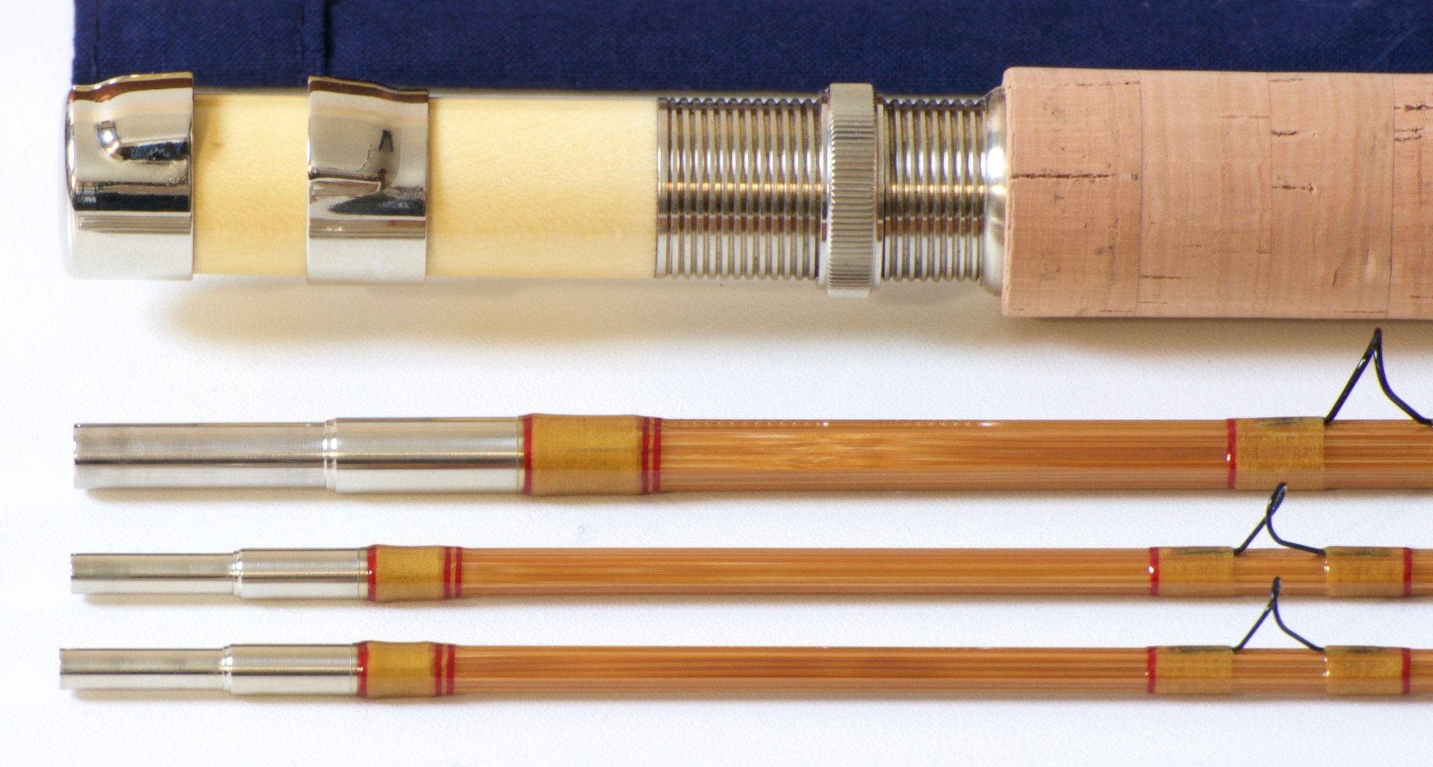 Here is the latest from the team of Amelia Tufts and Gabe Batson, an 8' 3/2 5wt bamboo rod. Mint condition. Amelia and Gabe are cranking out some seriously stunning fly rods. The casting ability of the rods and attention to detail that they put into each rod is tremendous! This latest creation has a beautiful red agate stripper, oxidized guides, bright nickel-silver hardware, and a downlocking reel seat over a stunning Holly wood spacer that resembles ivory! The three-tier nickel silver winding check adds a wonderful artistic touch to the rod. Medium dry-fly action. The rod effortlessly loads a DT5. Feels balanced, light and controlled with plenty of reserve power. Semitransparent silk wraps tipped amber. Subtly shaped cigar grip. Polished nickel-silver ferrule plugs. Cotton poplin bag with hang tag, mill-finished aluminum tube. The rod weighs 4 1/2 oz. and the ferrules are size16/64 and 10/64. The tip tops are 0.0775", or 5/64. Don't let this one get away!