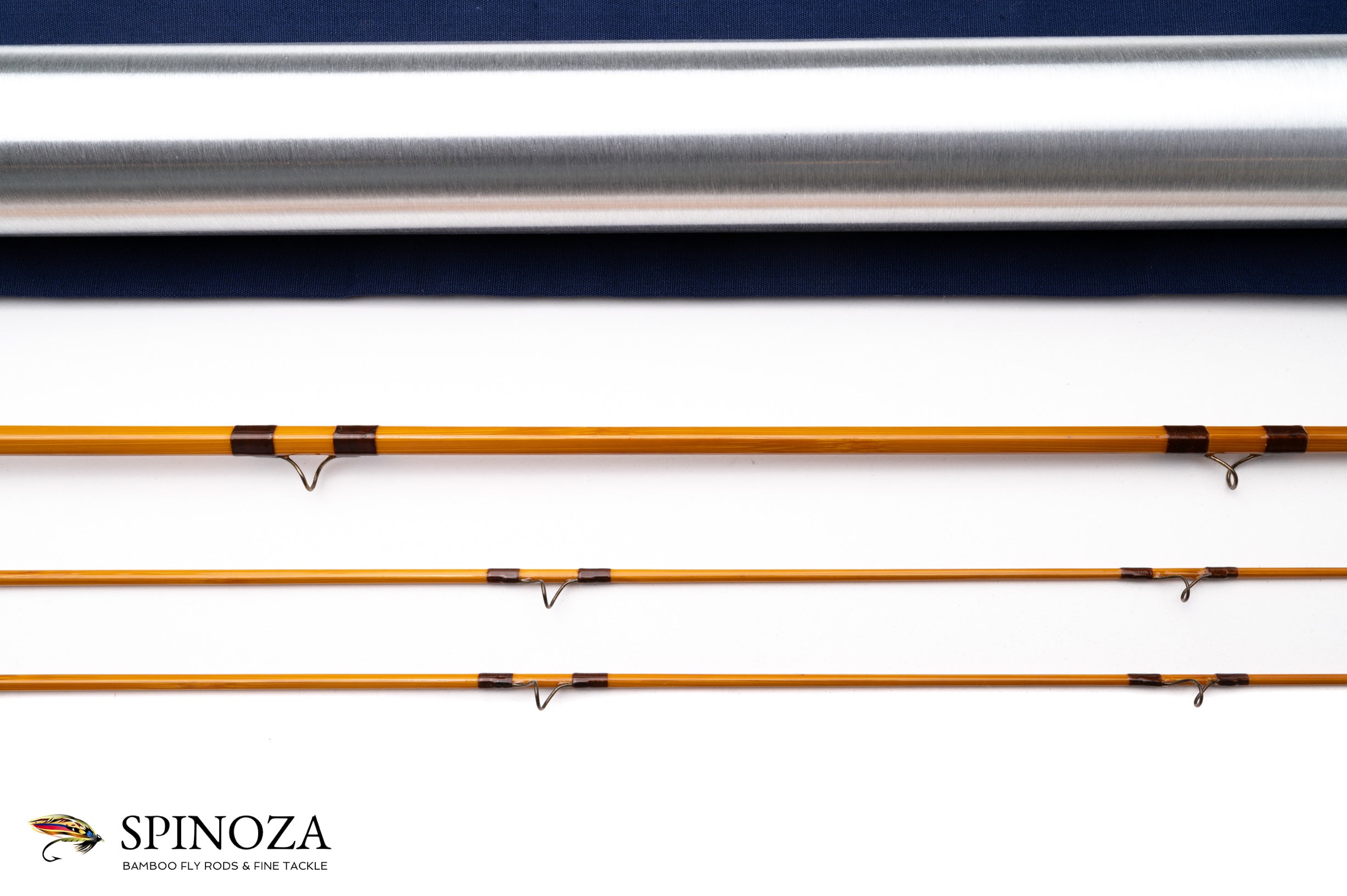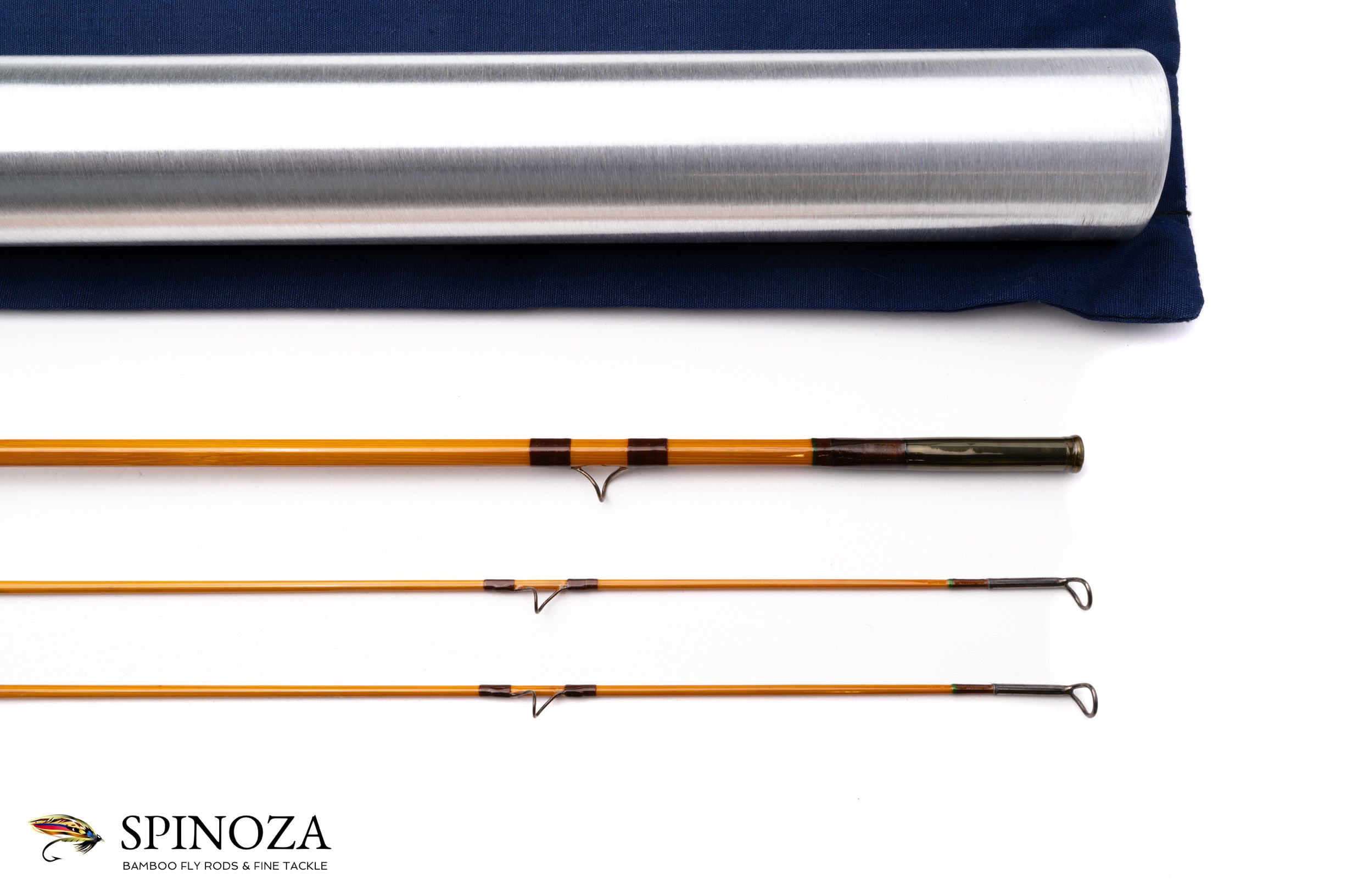 A nice Uslan bamboo fly rod, 8', 2-piece, 2-tip, and built for a #6 line. Pentagonal design. This rod was restored by Sam Carlson in 1997. Fast DF action. Blonde cane with brown main wraps and bronze snake guides. The Super Z style ferrules are oxidized. The 6 1/4" long medium cigar grip is clean as a whistle, having been replaced by Sam. The reel seat is a down-lock aluminum FE Thomas screwlock with a nickel silver pocket cap. The spacer is Pakka wood (artificial). As with all Sam’s work, the varnish is exceptional. The rod comes in a blue cloth bag and a brushed aluminum tube.