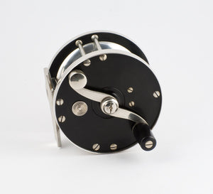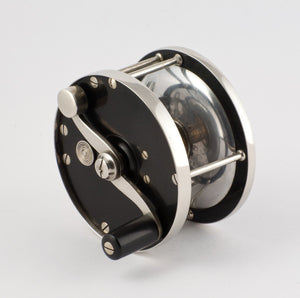 For sale here is a classic Edward Vom Hofe Model 423 "Restigouche" Salmon fly reel in excellent overall condition. Size 2/0 - 3 3/8" diameter, spool width of 1 3/8" and weighs 10 1/2 oz. This reel carries the 1896 patent on the sliding oil cap. German silver safety bands and pair of double roller bars. The reel has a strong adjustable drag and click. This reel has the seven detent arrowhead pointer drag feature with very bright red dot indicators.The offset reel foot is full length, unmolested, and includes a 2/0 marking on it and serial number R460 dating the reel to 1925. The reelcomes with what appears to be its original leather case in good condition (the strap has become detached but can be sewn back on easily enough), marked 2 0 on the back. The attached catalog scan is from 1928. You will not be disappointed!