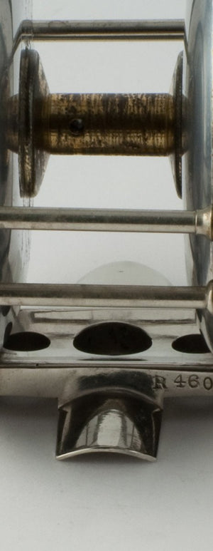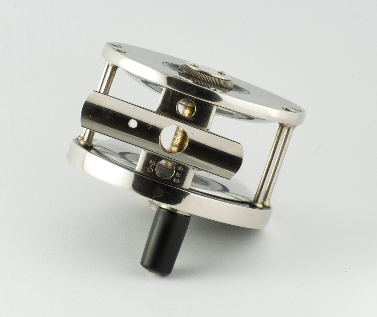 For sale here is a classic Edward Vom Hofe Model 423 "Restigouche" Salmon fly reel in excellent overall condition. Size 2/0 - 3 3/8" diameter, spool width of 1 3/8" and weighs 10 1/2 oz. This reel carries the 1896 patent on the sliding oil cap. German silver safety bands and pair of double roller bars. The reel has a strong adjustable drag and click. This reel has the seven detent arrowhead pointer drag feature with very bright red dot indicators. The offset reel foot is full length, unmolested, and includes a 2/0 marking on it and serial number R460 dating the reel to 1925. The reel comes with what appears to be its original leather case in good condition, marked 2 0 on the back. The attached catalog scan is from 1928. You will not be disappointed!