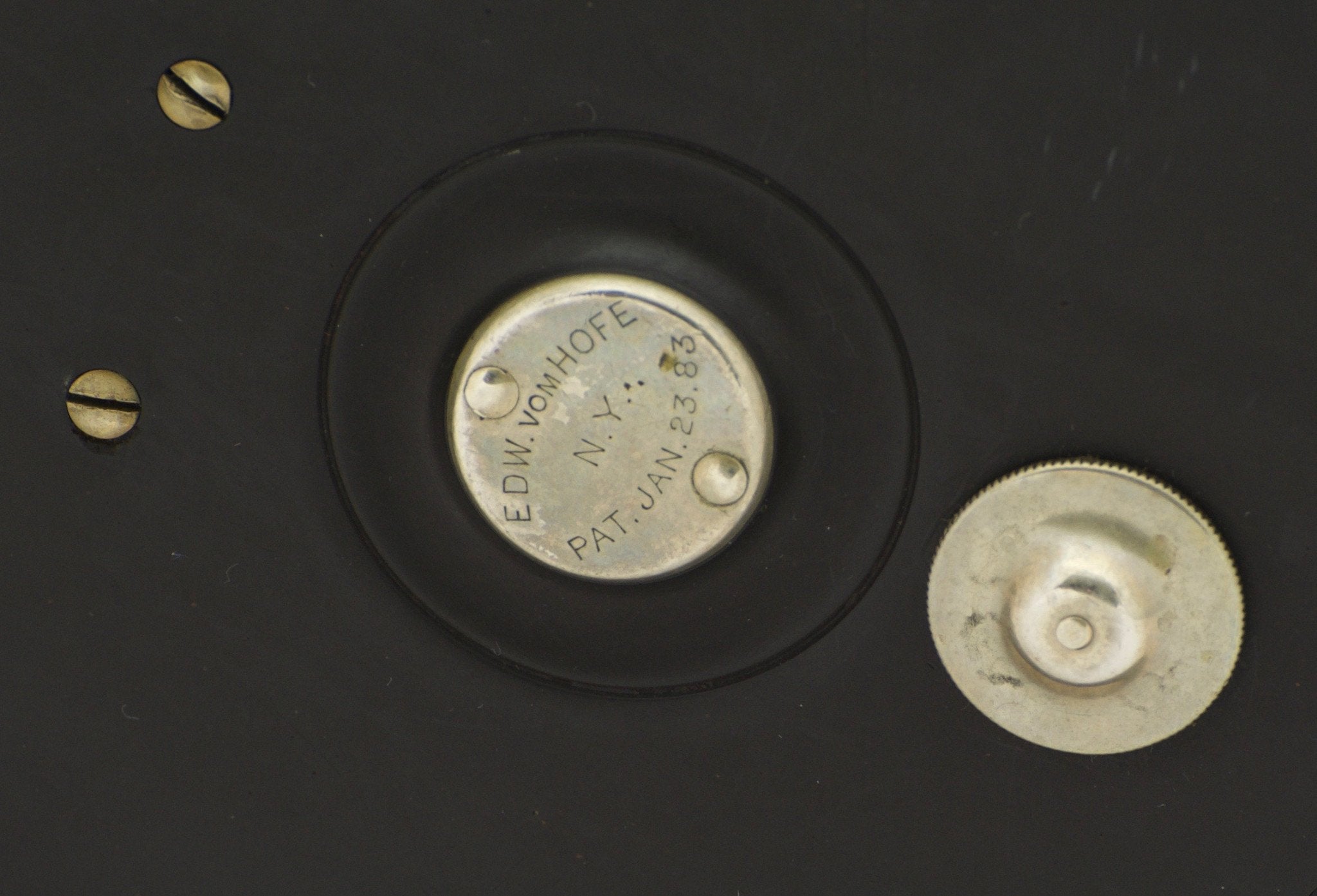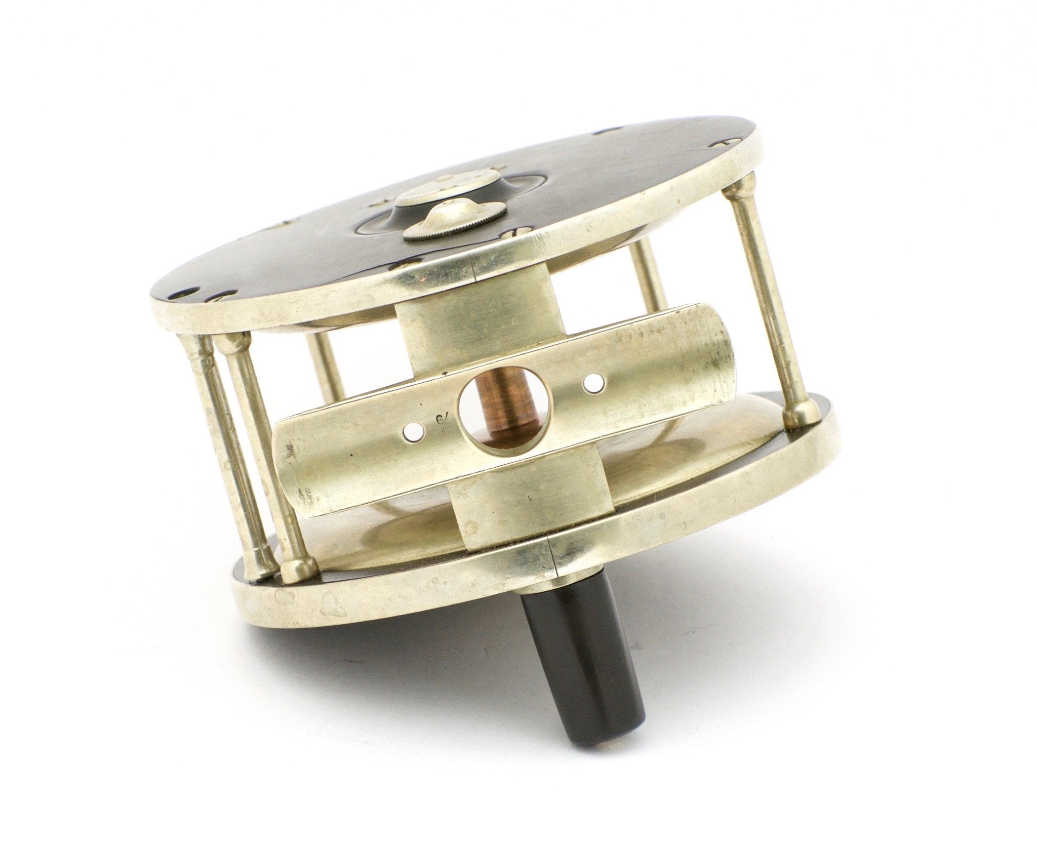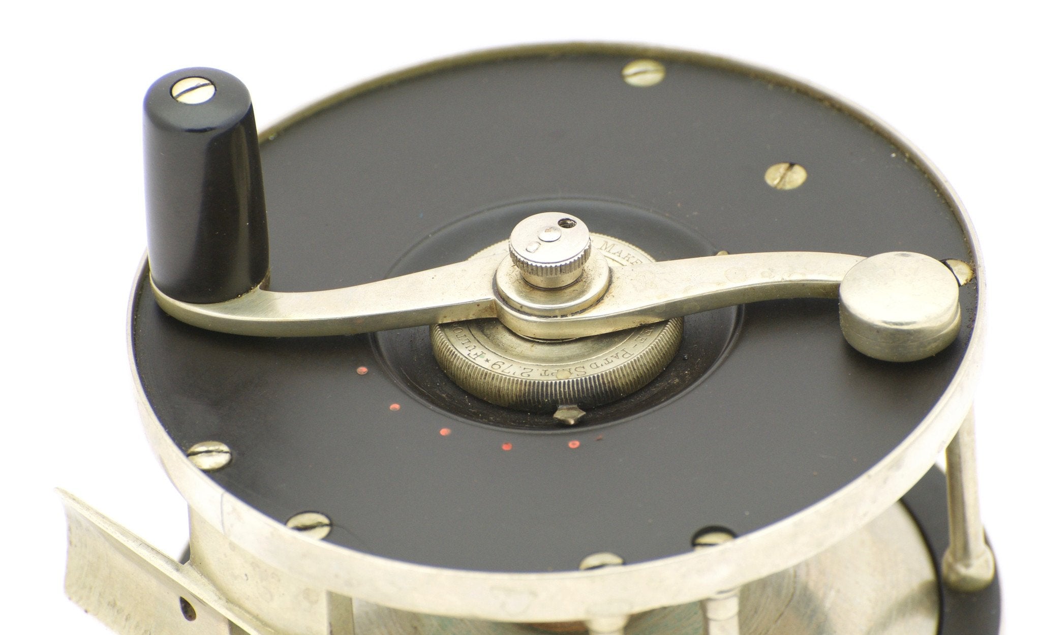 For sale here is an early Restigouche salmon fly reel made by Edward Vom Hofe. Size 6/0. No serial number. The reel is in very good condition with two cracks in the hard rubber, one by the foot screws on both sideplates. This reel carries the Sep 2, 1879 patent on the drag adjustment knob under the handle arm, as well as the Jan 23, 1883 patent mark for the sliding click drag. German silver safety bands and one double roller bar in the rings-up position. The spool is also German silver and spins in the same direction as the handle. The reel has a strong drag to this day and fully functional. Full-length and unfiled n/s foot with a 6/0 stamp. Comes with a Vom Hofe stamped leather case in poor condition.