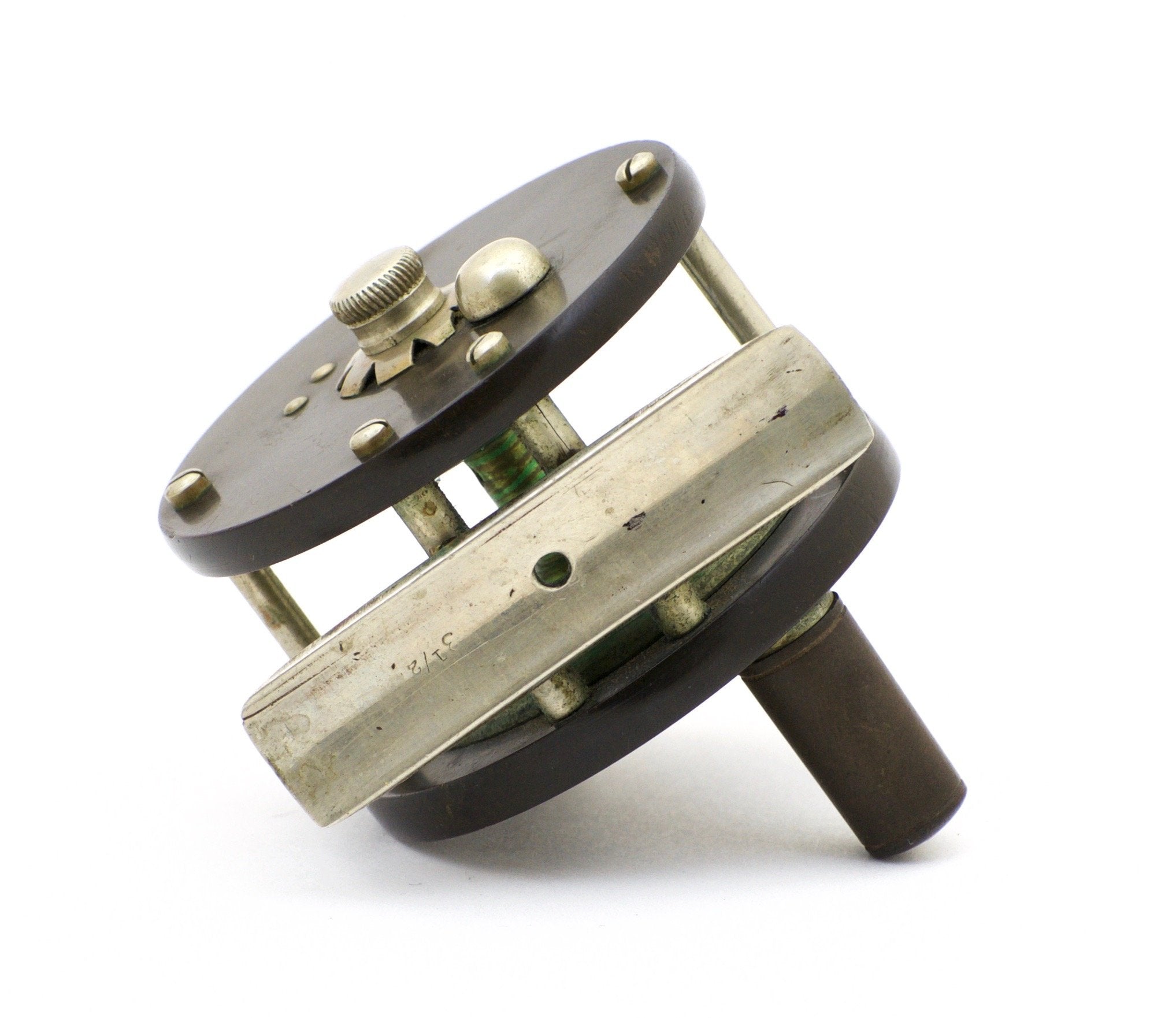 For sale here is a fine example of an ebonite-rimmed fly reel made by Julius Vom Hofe. Size 3 1/2 with a diameter of 2 3/8", pillar length of 1" and weight of 4 1/4 oz. Excellent original condition.