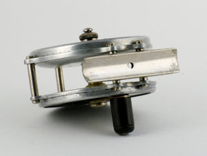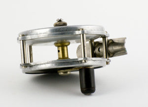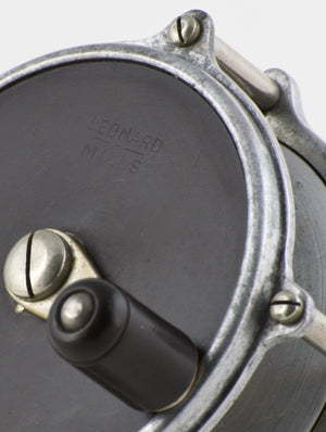 For sale here is a Julius Vom Hofe / Leonard Mills Model 44 raised pillar fly reel in good original condition. Aluminum and hard rubber construction. 3 inch diameter, measured pillar to pillar. No cracks in the hard rubber. Good click but the spool rubs while winding, which needs to be addressed by a reel mechanic. The reel foot is full length and unmolested. The on/off click switch works fine. Stamped "Leonard Mills" on headplate.