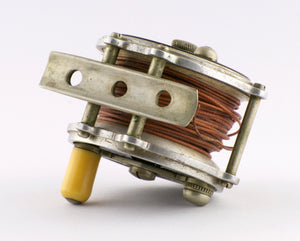 For sale here is a Leonard Mills Model 44B raised pillar fly reel, made by Julius Vom Hofe. Excellent- original condition. Catalogued as having a 2 1/4" diameter (not including the pillars) and a 1 1/16" spool width. No cracks in the hard rubber side plates. Aluminum frame and spool with no corrosion. Nickel silver foot, handle arm, pillars, and screws. Excellent fixed click operation. The perforated reel foot is full length and unmolested. The taiplate click switch works as intended. Stamped "Leonard Mills" on headplate. A very scarce wide spool Model 44B! It would polish up very nicely.