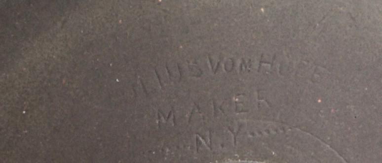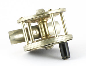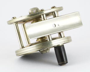 For sale here is a Julius Vom Hofe made size 4 nickel silver & hard rubber fly reel. 2 1/4" diameter, 1" wide spool. Hard rubber side plates, half-crank style handle and nickel silver incised rims (on both rings!) Artfully bolstered pillars, knurled bearing cap, and knurled handle arm screw. The JVH stamp is fairly clear on the headplate. Condition is excellent, with blemish free and unpolished hard rubber, strong constant click and full length, unaltered german silver foot. Right hand retrieve. All screws are in good condition.