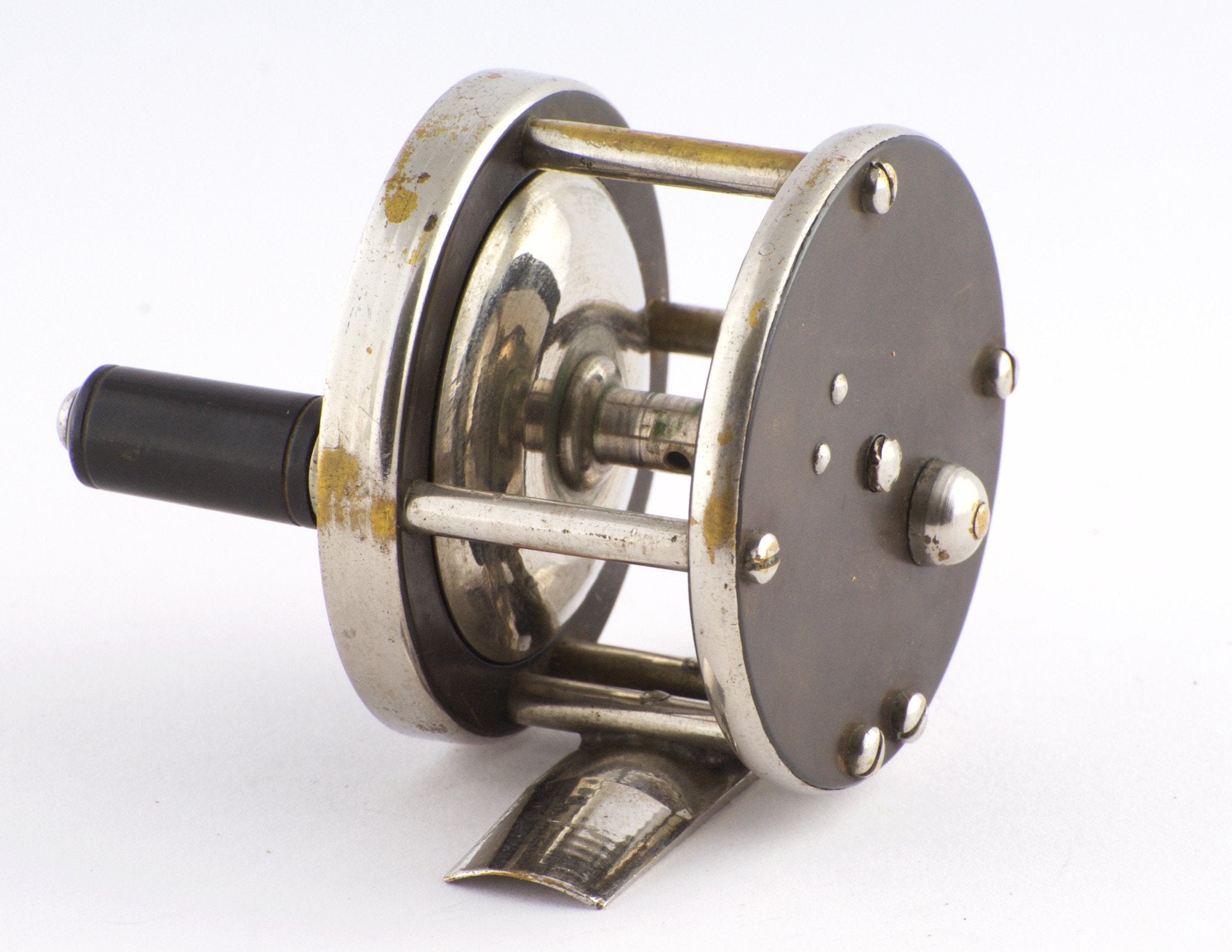 For sale here is a Julius Vom Hofe made size 4 fly reel, stamped on the headplate, "Julius Vom Hofe Maker N.Y." 2 1/8" diameter, 1" wide spool. Hard rubber side plates and nickel plated hardware. The reel is in excellent overall condition with some plating loss. Blemish-free and unpolished sideplates, good click and full length, unaltered foot. The reel favors left-hand retrieve.
