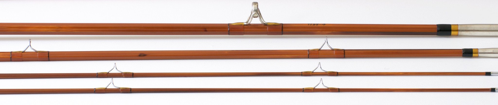 For sale here is a Signature Series bamboo rod from JD (Jeff) Wagner. 7 1/2 feet 3/2 for a 5 weight line. This is the 4th rod Jeff built in 1997 according to the 1197-4 serial number on the butt section. Highest quality Super-Z style nickel silver ferrules, top-grade nickel silver screw uplocking reel seat, red agate stripping guide, exclusive rope braid sterling silver hook keeper, translucent silk wraps with black tipping, and immaculately dipped spar varnish finish. Original bag and replacement tube. The rod weighs 5 1/8 oz. and the ferrules are size 11 and 16. Overall condition is excellent plus. Medium fast action.