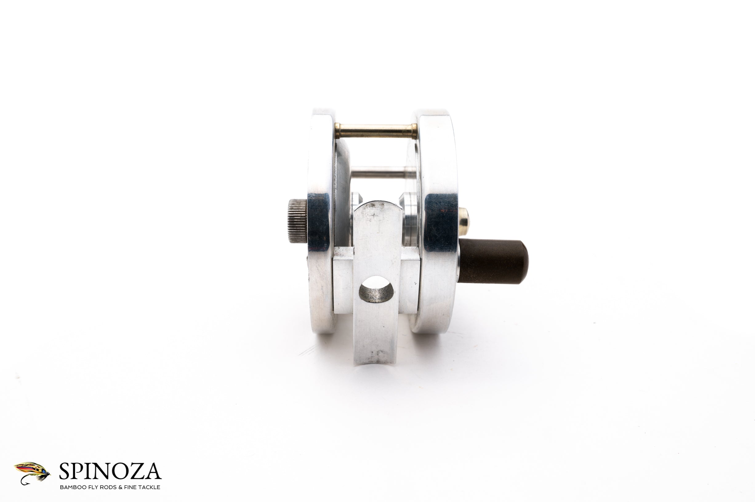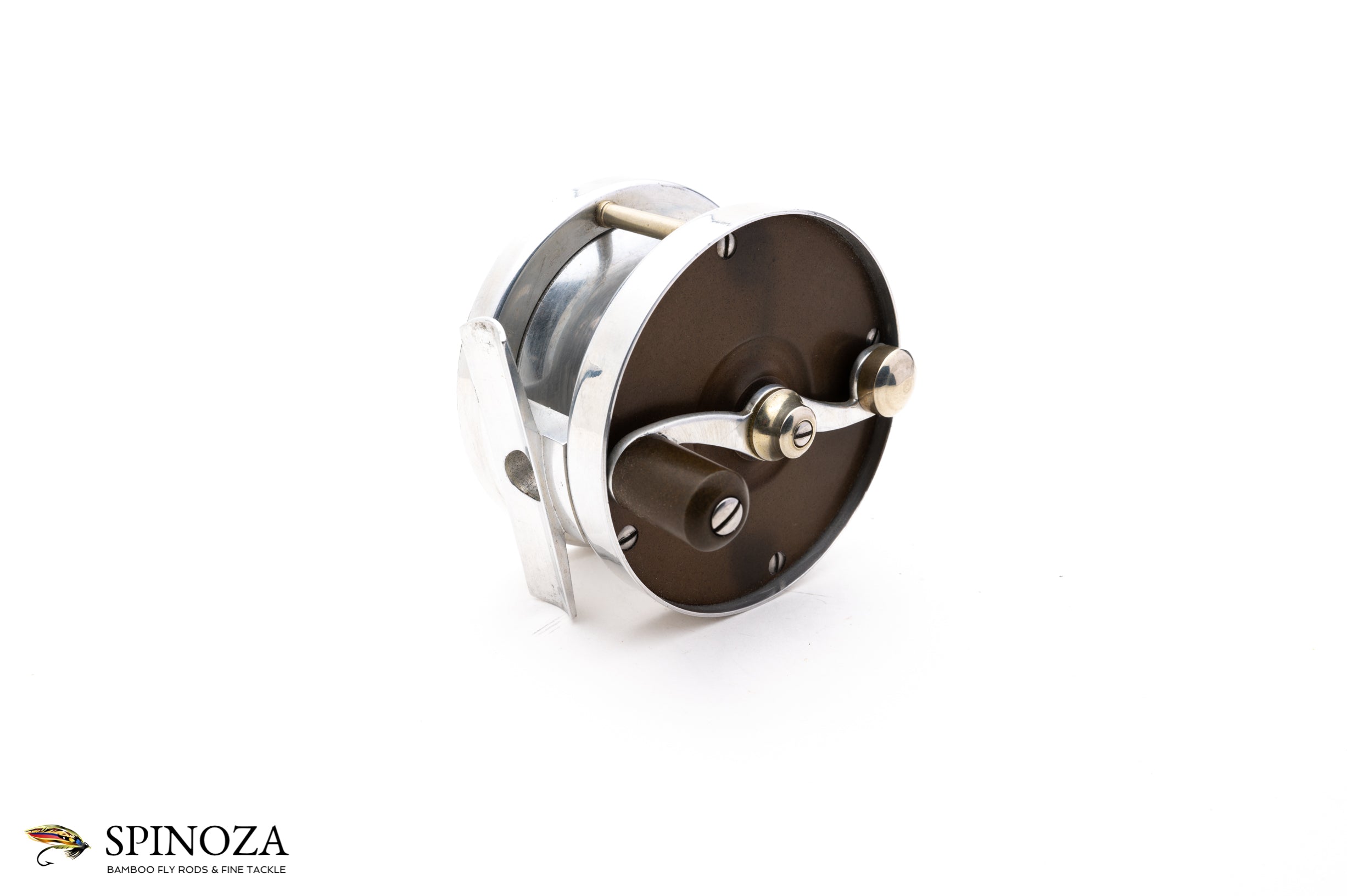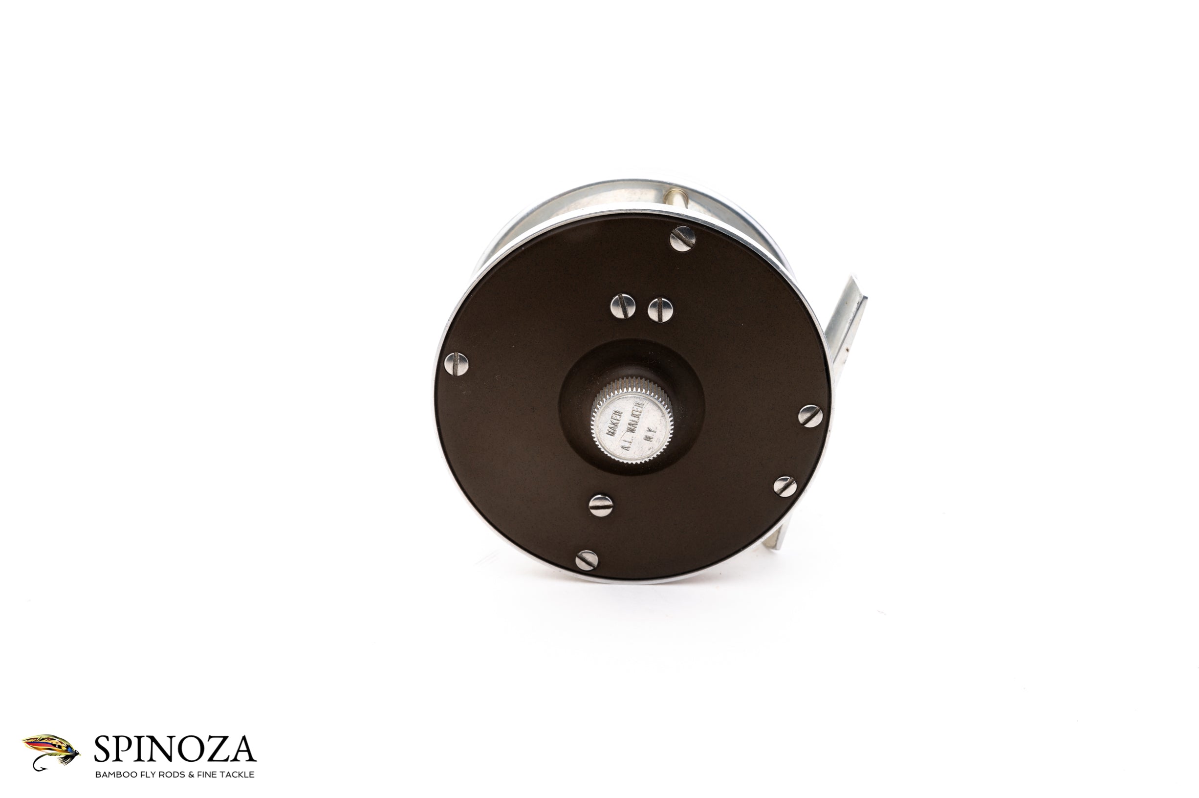 A nice Walker TR2 light trout fly reel, set up for LHW. 2 3/4" diameter with a 15/16" spool width. Excellent used condition with very minor scuffing to the german silver frame edges but very clean throughout. The hard rubber sideplates are very clean though have oxidized slightly to a brownish color (this could be easily addressed if the buyer so chooses). Fixed click check. Designed to hold a #4 line and 50 yards of backing. No bag. A fine example of a light trout classic s-handle reel.