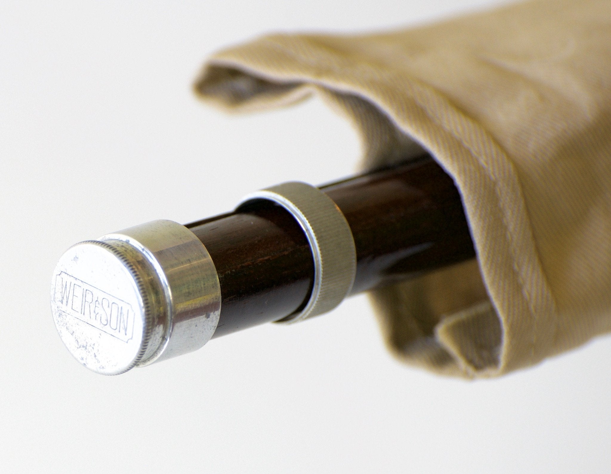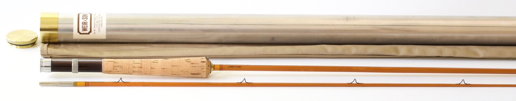 For sale here is a J.L. Weir & Son bamboo rod - 7' 4wt. Made as a 1 tip rod. Serial #D702-19-80. According to Weir catalog,“D” designates the rod as being of the Dry Fly series and is rated for a DT4. Made in 1980. Ritz style grip, aluminum cap and ring slide-band seat with mahogany spacer. Butt cap is stamped with company name. Light tan wraps on ferrules, transparent wraps on guides. Bright ferrules with witness marks fit very well. Original bag and tube. A nice American dry fly rod from an underappreciated California maker. Excellent+ condition.