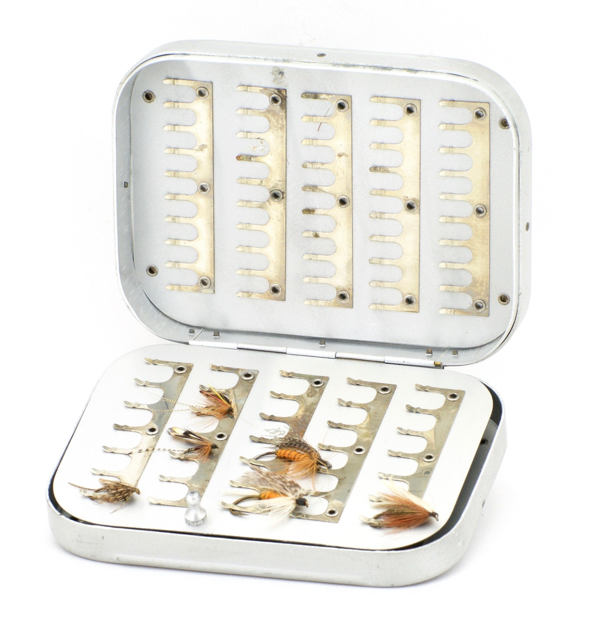 For sale here is a Wheatley salmon fly box with clips. Excellent condition. 5 rows of 10 clips on two leafs and 5 rows of 7 clips on the other two leafs (capacity 120 flies). All clips remain strong and all of the flies appear to be in unused condition. There are 50+ flies included.