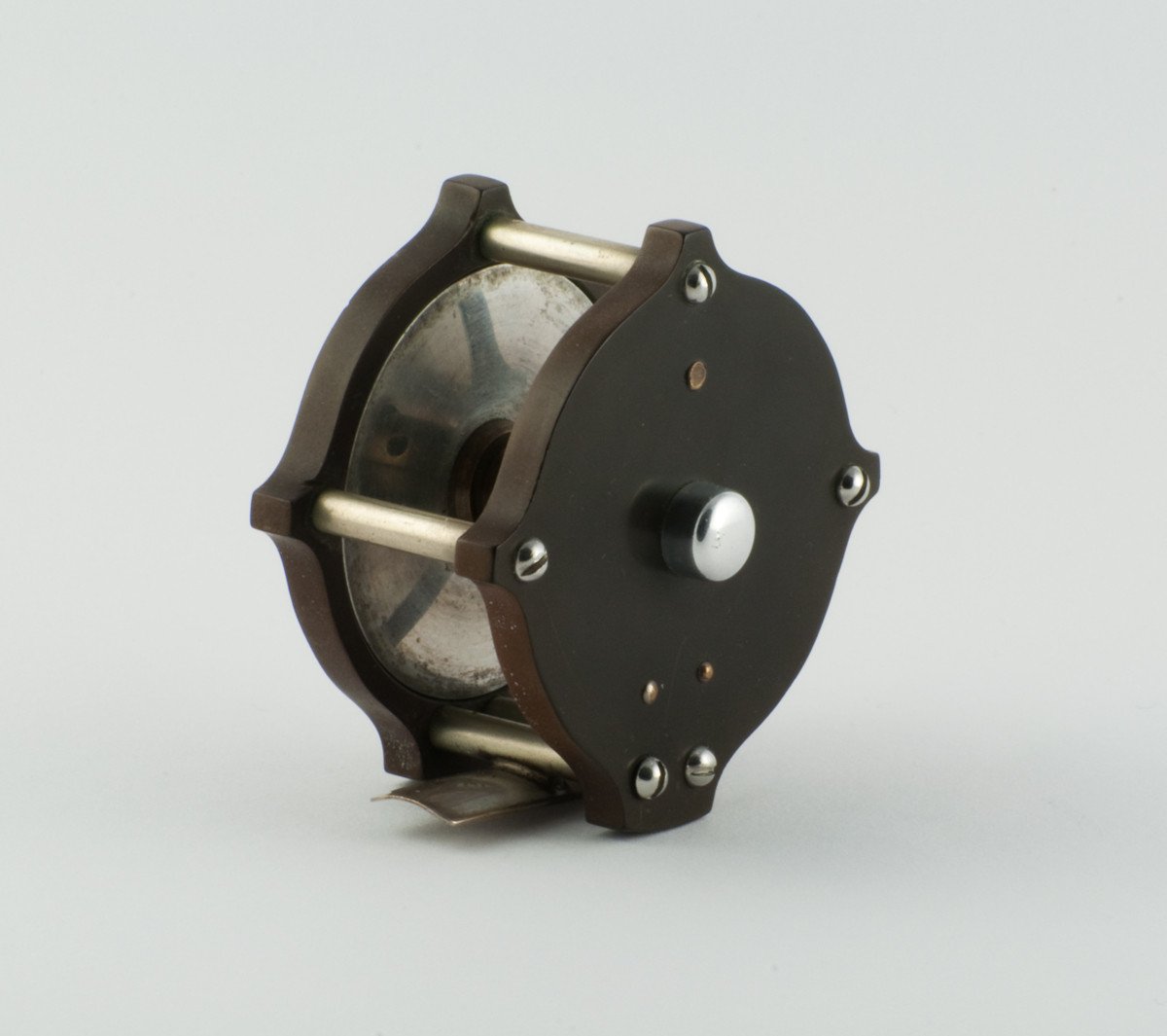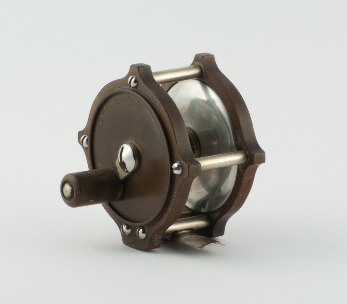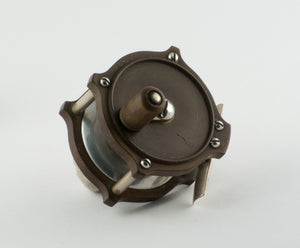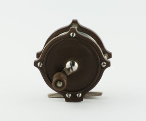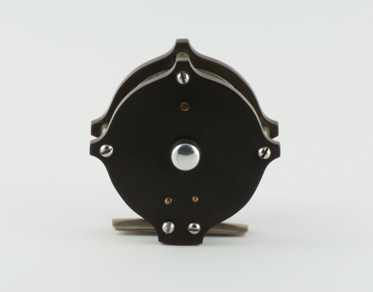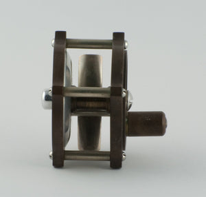 For sale here is an original William Mills & Son "Fairy" Raised Pillar / Hard Rubber Fly Reel. Specifically made for use with the Leonard Baby Catskill fly rods, this 2 1/4" diameter (pillar to pillar) reel features an aluminum spool and nickel silver fittings. The tiny crank handle has a hard rubber grasp and the foot is full length and straight. The reel overall is in excellent plus condition, inside and outside. There is one faint scratch (not a crack) in the ebonite on the headplate (see last photo). Stamped "William Mills & Son N.Y." on headplate.