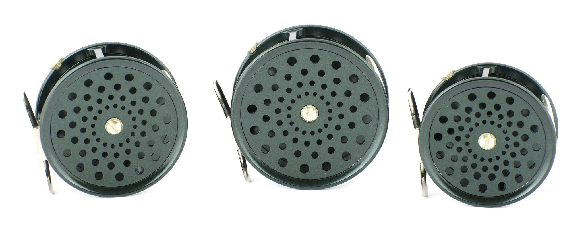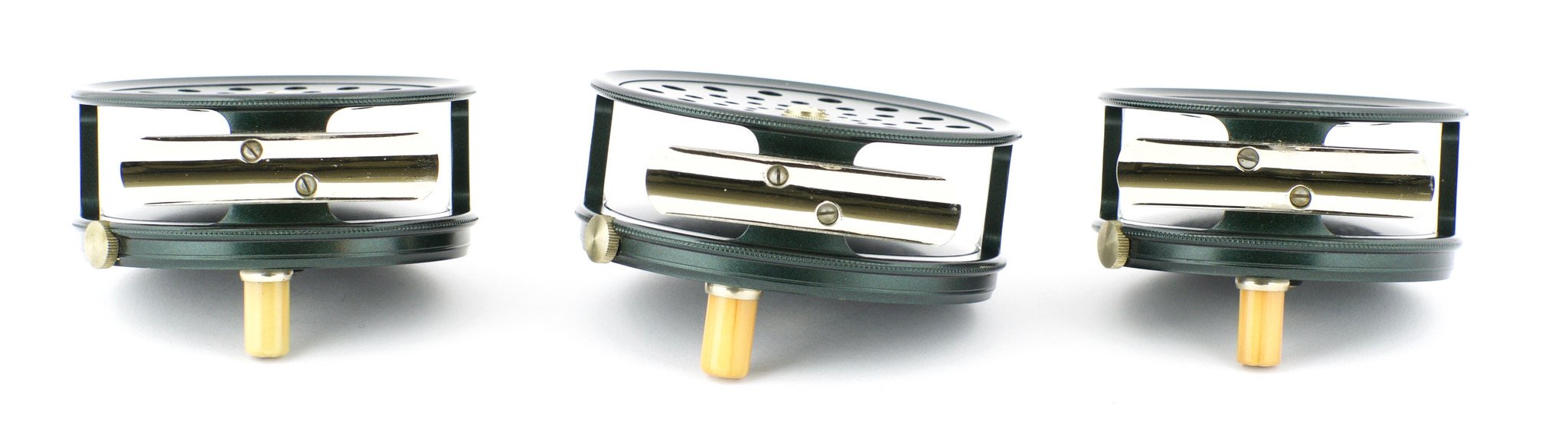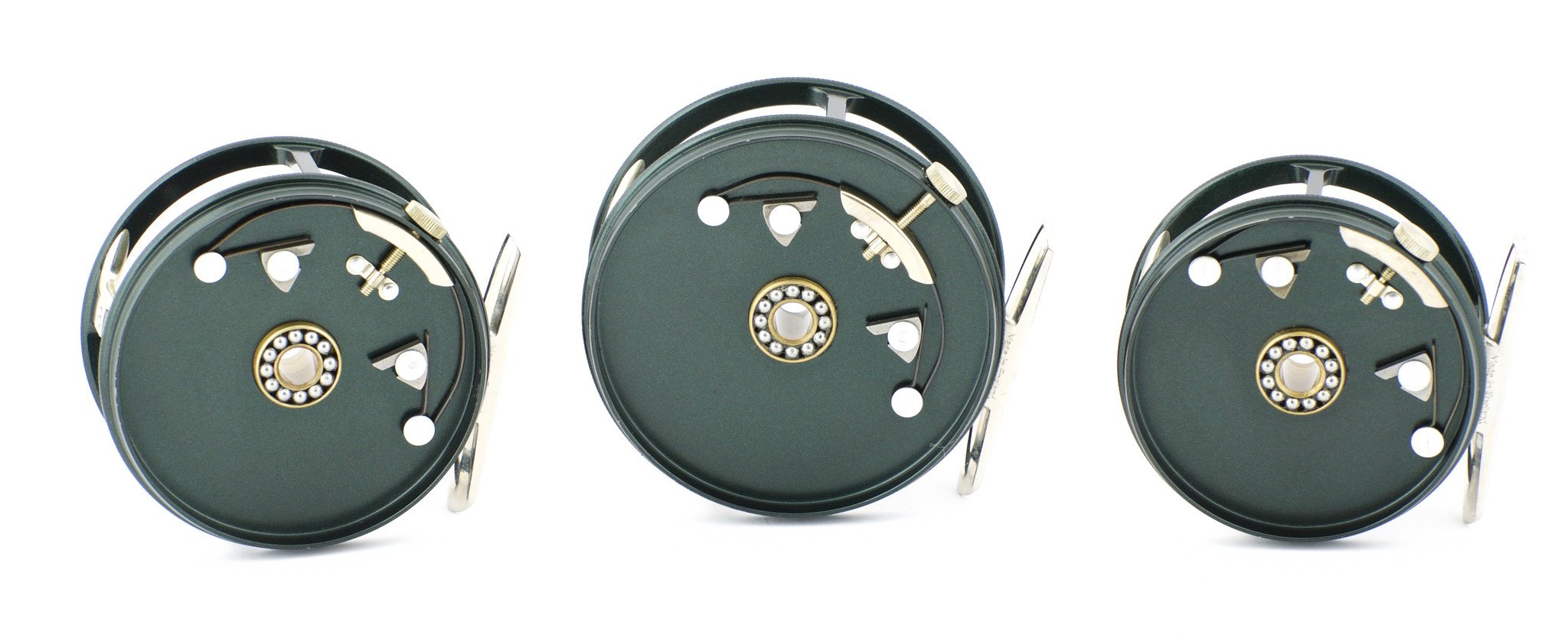 For sale here is an unused Winston Perfect reel set made in 1999, commemorating Winston's 70th year in business. This is #49 of the first 100 sets made with the original painted finish. There are some slight handling marks on the reels but they've never been lined. The set consists of three reels: 2 7/8" / 3 1/8" / 3 3/8". The reels are housed in a felt lined curly maple case. The wood is slightly cracked on one corner by the back hinge and the hinge is loose as well, but the case does close. The warranty card and booklet are included with the sale.