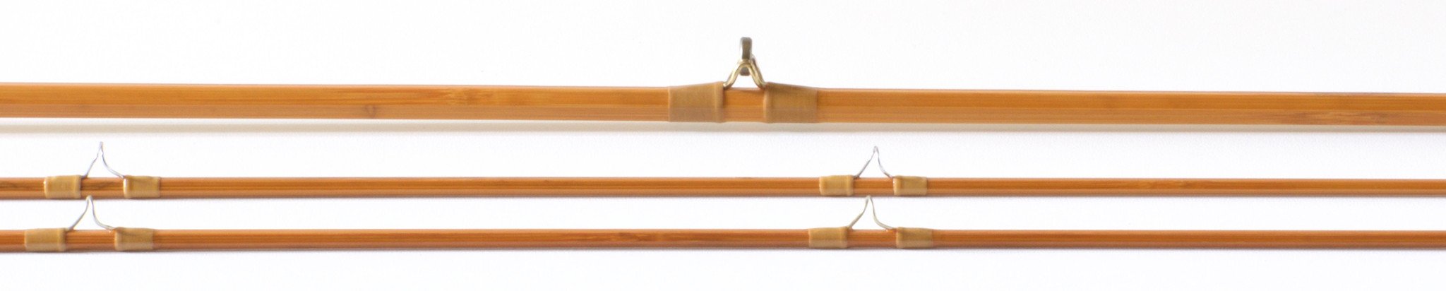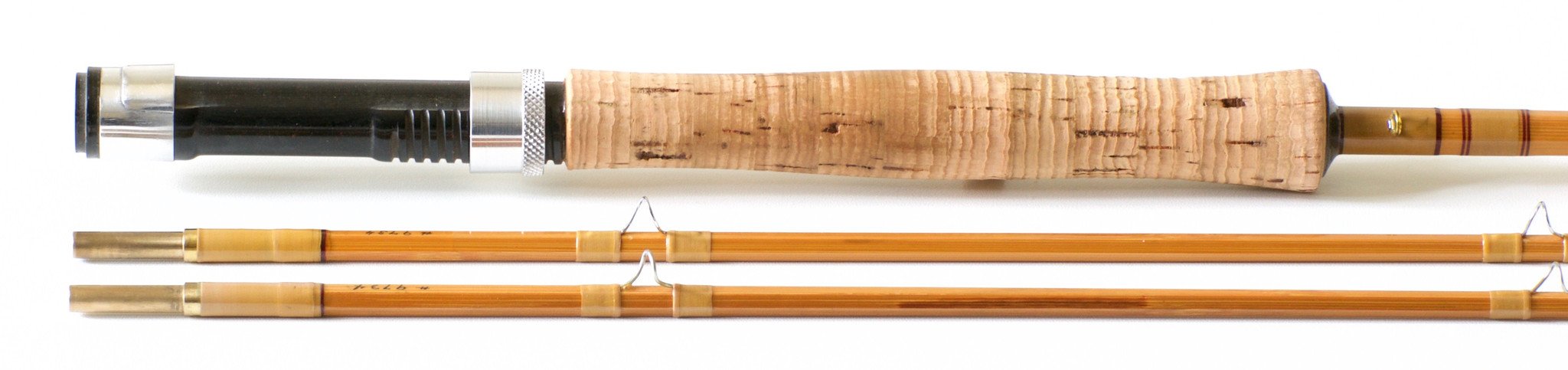 For sale here is a San Francisco / Doug Merrick era R.L. Winston bamboo rod - 8 feet, 2/2 marked 4 oz. Best with a 5 weight line. Serial no. 9734. Excellent condition overall. Originally delivered as a one-tip rod. An extra tip was made by Glenn Brackett. Tan wraps with maroon tipping. The down-locking bakelite reel seat is in fine shape. Full wells grip has light ridging but otherwise very nice. Ferrule size 14/64, the fit is perfect. Original tube and bag. Medium fast action. A very nice all-around trout rod.