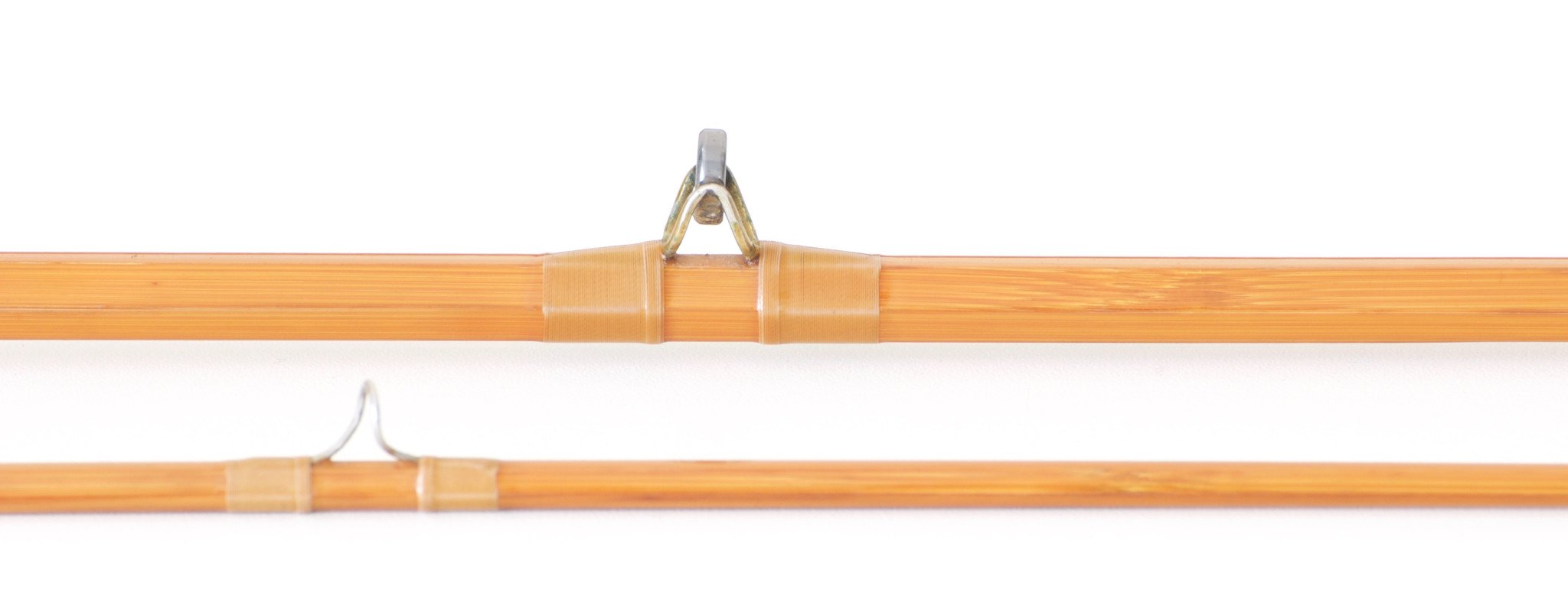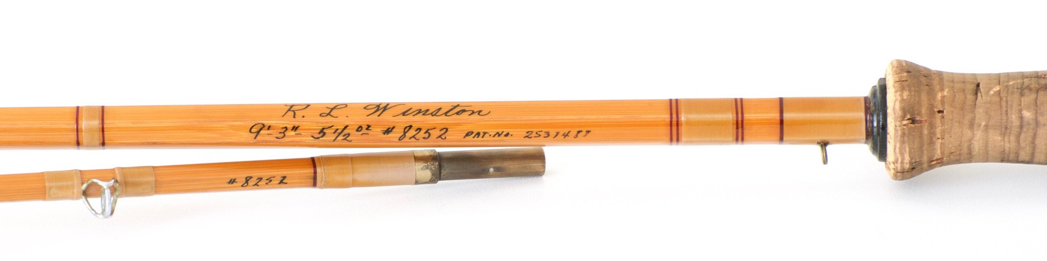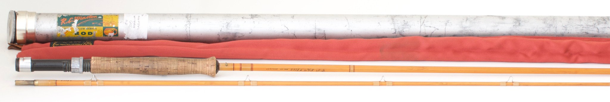 For sale here is a San Francisco era Winston bamboo fly rod - 9'3" 5 1/2 oz. 2/1. Serial no. 8252. Made by Doug Merrick and Gary Howells in 1958. The rod is in excellent original condition. All sections are full length. Pumpkin-toned cane. The rod features beige wraps with burgundy tipping at the winding check, signature wrap, ferrules, and tip-top. Bright guides. Bronzed ring hook keeper. Handsome, sculpted bakelite winding check. The full wells grip is soiled as one would expect but free of any major defect. There is very light ridging as well. Down-locking, bright aluminum reel seat with a classic Winston bakelite spacer. The ferrules are size 16/64, the fit is perfect. The rod weighs 5 3/8 oz. on our digital scale. The action is on the faster side of medium-fast. Includes original bag with label and tube with label 85% remaining. Don't miss out on this fine SF Winston!