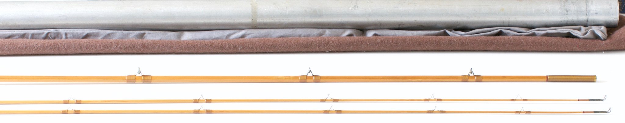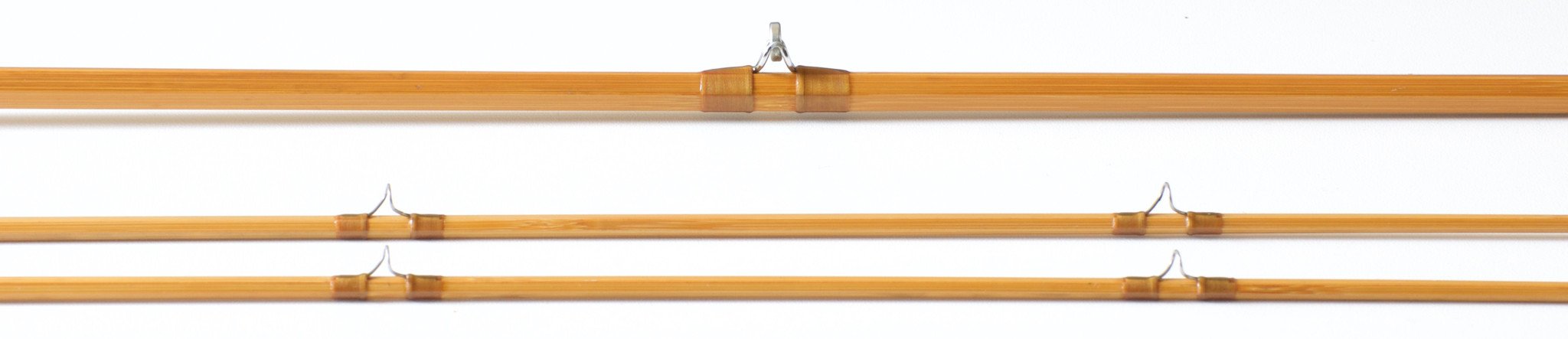 For sale here is a San Francisco era R.L. Winston bamboo rod - 8'6", 2/2 marked 4 5/8 oz. Serial no. 8506. Excellent+ condition, all sections are straight and full length. Down-locking aluminum reel seat with a slot for an extension butt, which is not included with the rod. All three guides on the butt section are stripping guides as well as the first guide on each tip. Ferrule fit is excellent. The cork grip is in fine condition. The golden silks with maroon tipping blends nicely with the blonde cane. Medium fast action and feels best with a 6 line. Ferrule size 16/64. Rod weighs 5 3/8 oz. Original bag and tube with protective brown felt tube bag. Someone will be very happy with this rod!