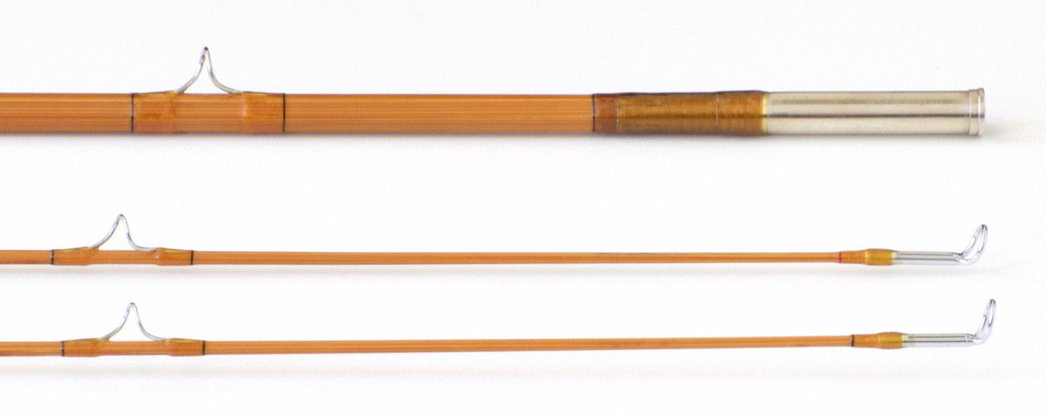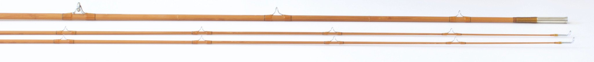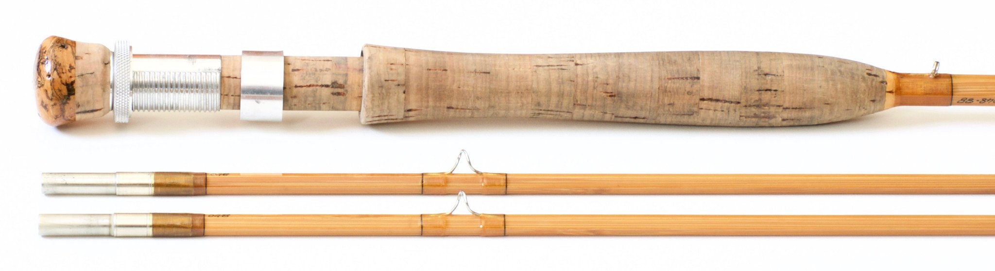 For sale here is a Mario Wojnicki six-sided, hollow-built bamboo rod - 8'8" (264cm) 2/2 for a WF7 line. Medium fast action. The rod is in excellent used condition. Honey colored cane. Transparent honey colored silk wraps with black edges. Bright guides, tip tops, and ferrules. Uplocking reel seat with aluminum fittings over a cork spacer. The reverse half wells grip has a fairly slim taper. The rod weighs 5 oz. The ferrules are 14/64. Comes with a replacement bag and tube.
