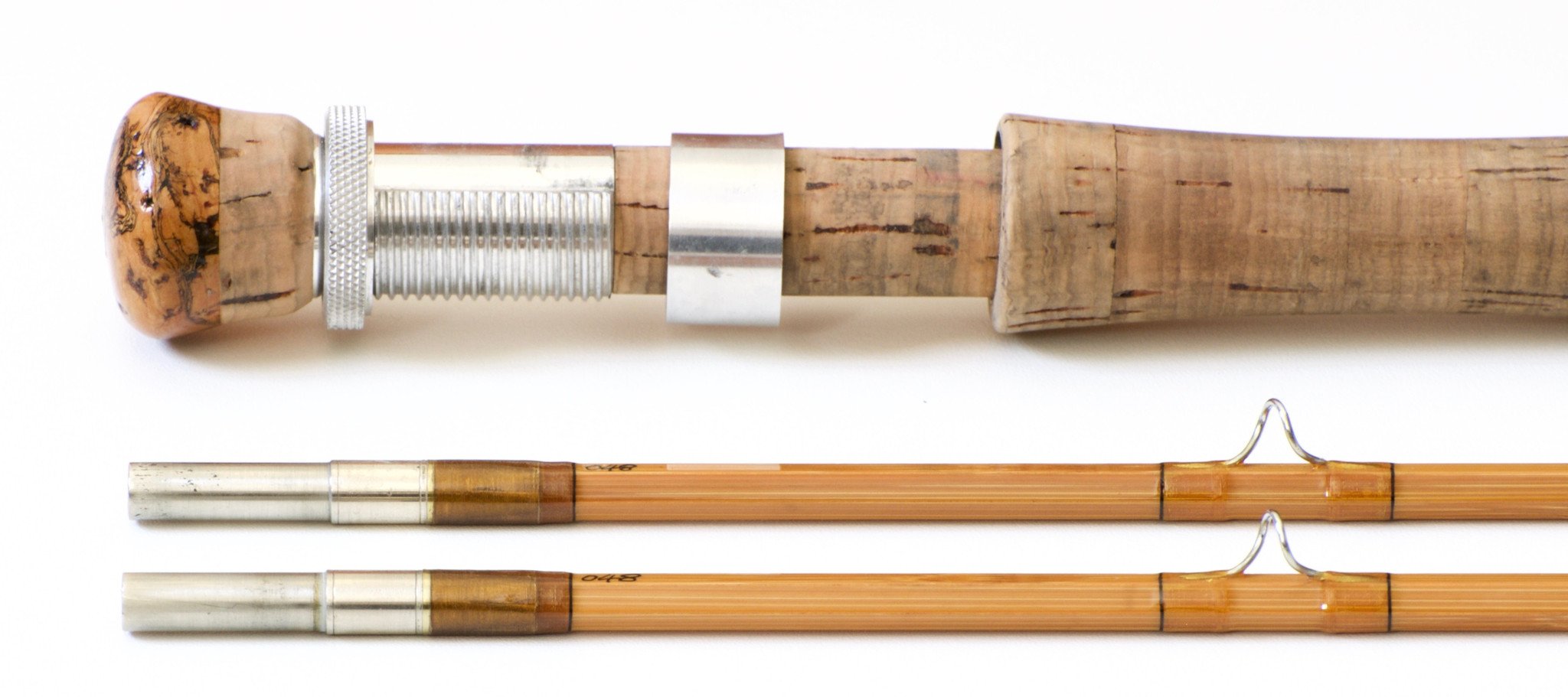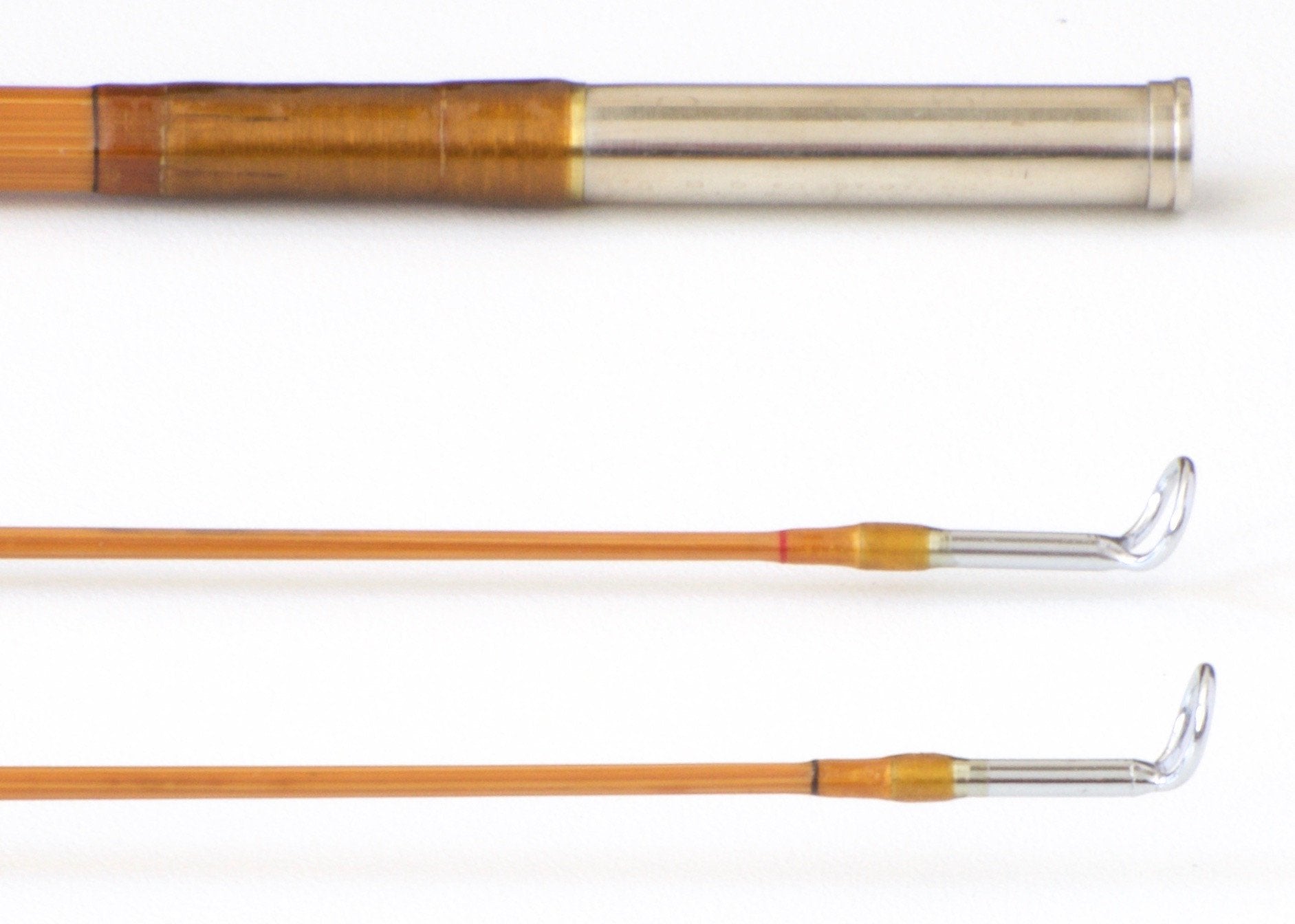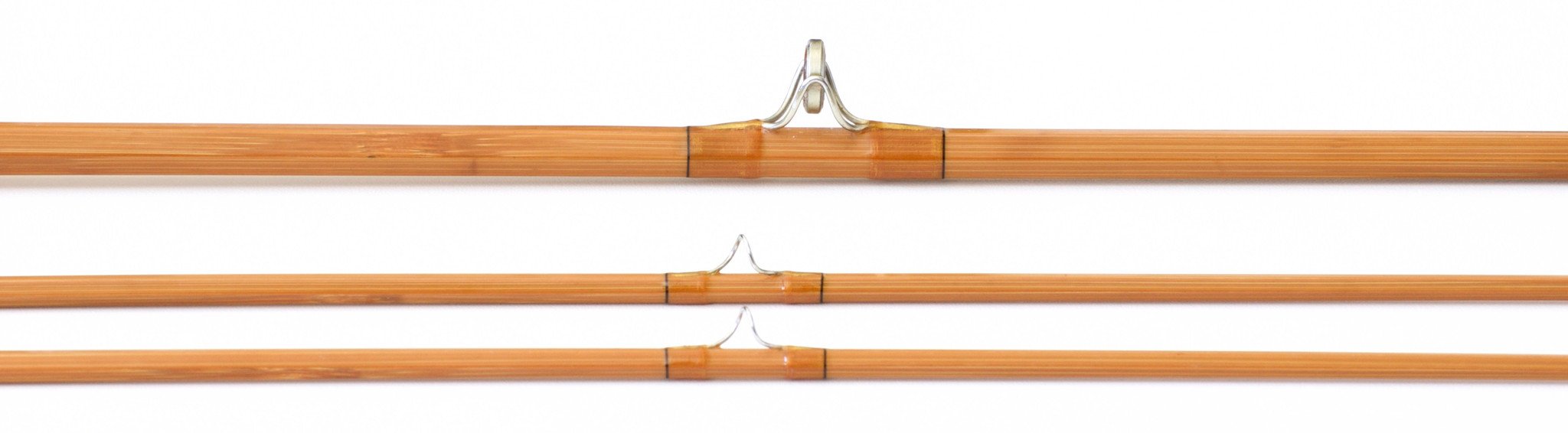 For sale here is a Mario Wojnicki six-sided, hollow-built bamboo rod - 8'8" (264cm) 2/2 for a WF7 line. Medium fast action. The rod is in excellent used condition. Honey colored cane. Transparent honey colored silk wraps with black edges. Bright guides, tip tops, and ferrules. Uplocking reel seat with aluminum fittings over a cork spacer. The reverse half wells grip has a fairly slim taper. The rod weighs 5 oz. The ferrules are 14/64. Comes with a replacement bag and tube.