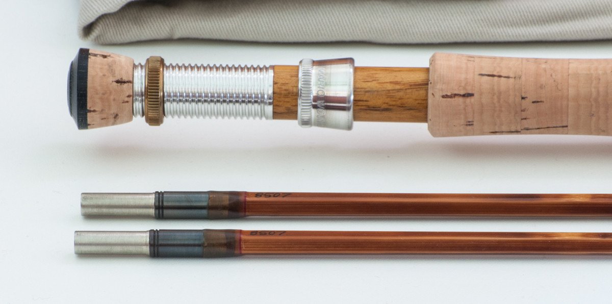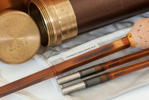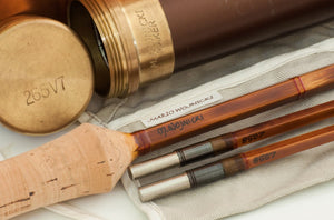 For sale here is a Mario Wojnicki five-sided, hollow-built bamboo rod - 265 cm, or 8'7" 2/2 for a 7wt line. Model number 265 V7. Serial #8507. The rod is in mint condition. Red agate stripping guide. Guides, tip tops, stripping guide and reel seat hardware are all bright. Ferrules are oxidized. Gorgeous wood spacer. Ferrules are short super-Z type. EC Powell-style wells grip. Powerful medium-fast action and a progressive taper casting dry flies to salmon or steelhead. The rod weighs 4 1/2 oz. Comes with original bag and tube. Mario's current pricing for a new rod, 7wt and above is $4,100. We also have this 8wt Wojnicki rod for sale.
