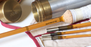 For sale here is a Mario Wojnicki five-sided, hollow-built bamboo rod - 8'8" (265cm) 3/2 for a WF8 line. Medium fast action. The rod is in mint/unfished condition with the paper still on the grip. Honey colored cane. Translucent silk wraps. Oxidized guides, tip tops, and ferrules. Uplocking reel seat with aluminum and brass fittings over a gorgeous olive wood spacer. EC Powell-style wells grip. The rod weighs 5 3/8 oz. Comes with original bag and tube. Save yourself a multi-year wait for a new rod from Mario and treat yourself to a Christmas gift for the upcoming steelhead runs!