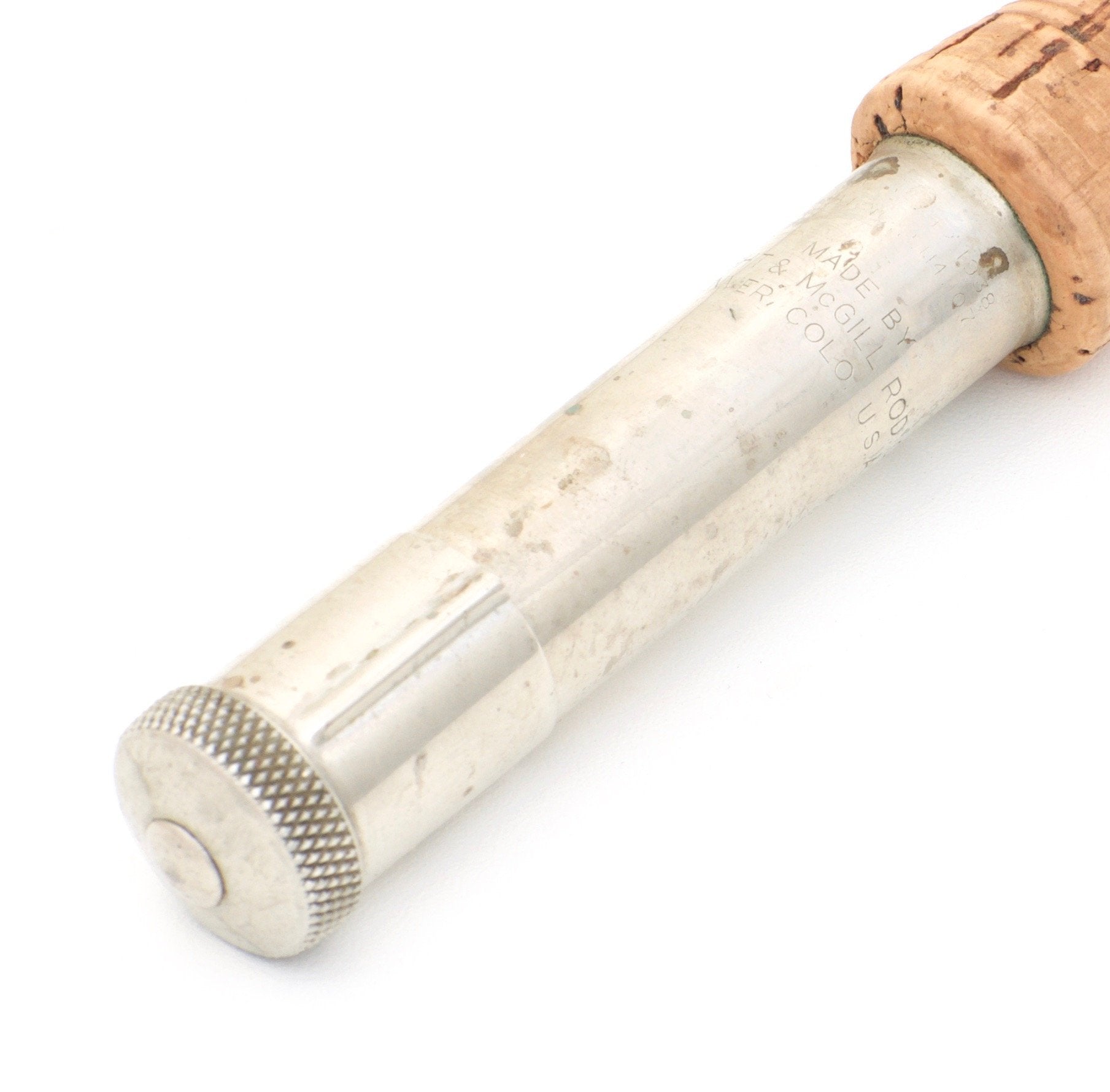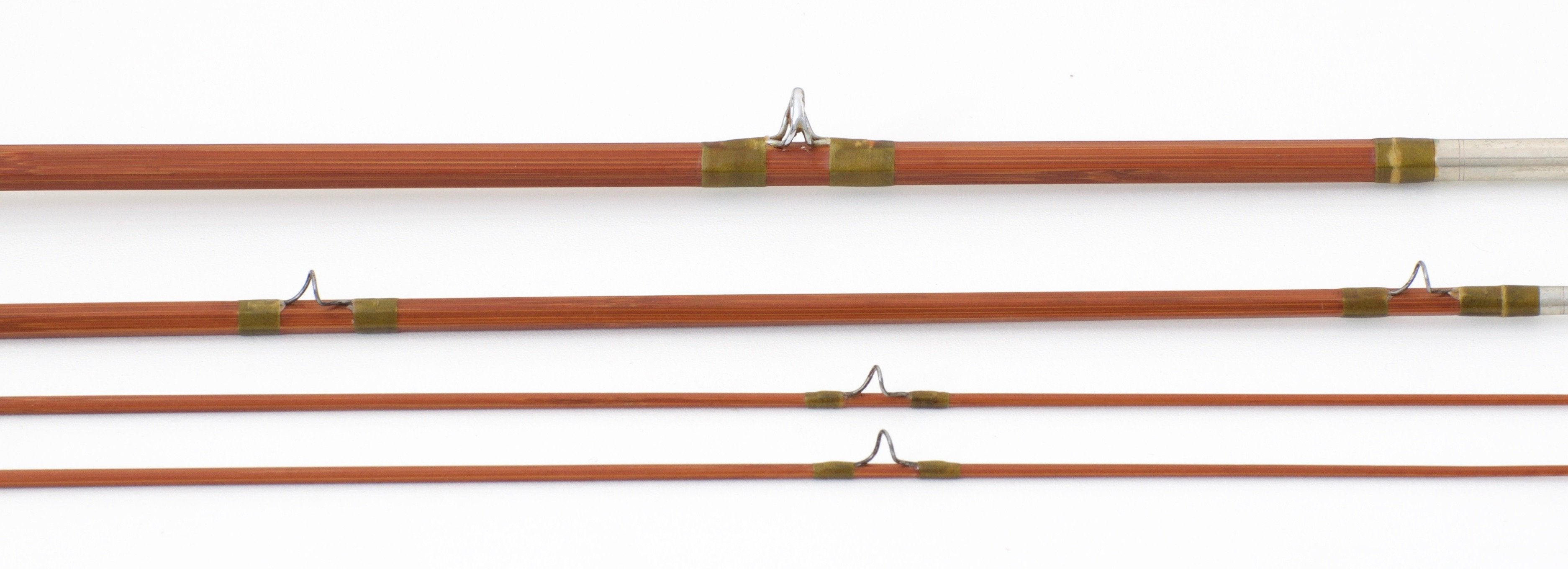 For sale here is a Wright & McGill Granger Special Model 8040 -- 8' 3/2 for a 4 or 5 weight line. The rod is in very good plus condition with a few cosmetic issues. The rod is mostly original with some minor repair work to some wraps as well as one having been re-wrapped. There is also a hairline crack in one of the tip ferrules that extends from the shoulder to the start of the male slide. Classic ammoniated cane with "Granger green" silks. The script is slightly faded but still legible. The initials "LCB" are stamped into the cane at the butt under the varnish. The grip is ridged. Patented uplocking nickel silver reel seat functions smoothly as it should. There is only one very small dent on the backside of the seat. The ferrules are size 15/64 and 10/64 and the fit is great. The rod weighs 4 1/2 oz. The action is classic medium fast. A terrific all-around trout rod. The rod includes its original bag and tube. There is a small hole at the bottom of the butt section sleeve of the bag. This could easily be mended.