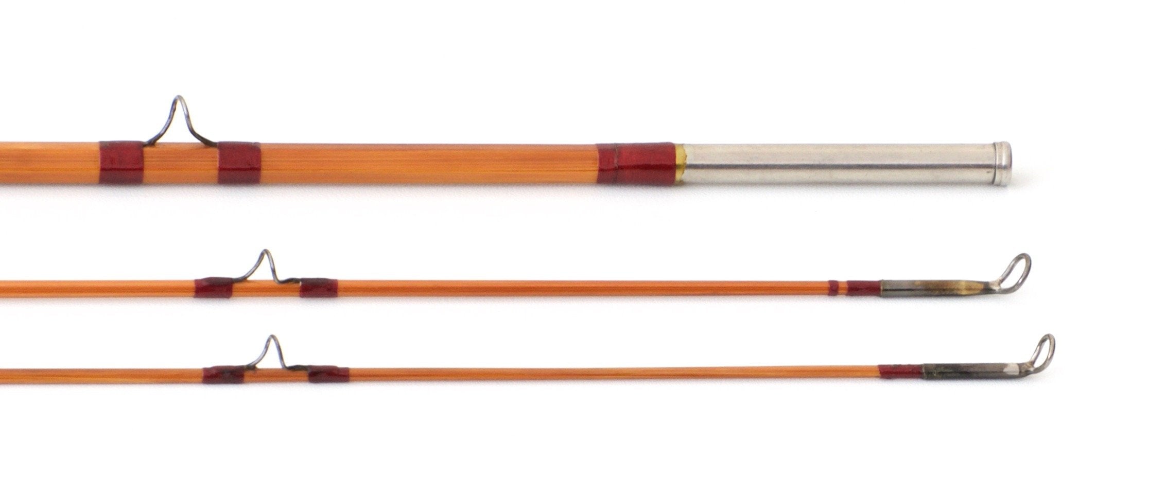 For sale here is a Paul Young Ace -- 8' 2/2 5-6wt bamboo rod. Excellent condition. The rod features medium-flamed cane, a smooth half wells grip with cork reel seat spacer and cap and ring reel seat with "Paul H. Young Co - Detroit" die-stamp on the butt cap. The ferrules are Pernack step-down type, size 14/64, and the fit is excellent. Dark burgundy wraps. The rod weighs 4.10 oz. with the original tip and 4.20 oz. with the replacement wet tip made by Bob Summers, who also provided a replacement cork grip and installed a hook-keeper. The second original tip was compromised and Bob agreed to make the replacement tip. Medium fast action and the taper is semi-parabolic. Very similar to a Para 15 but with a bit more cane in the butt section, making it less parabolic than the typical Para 15 he settled on later in the 1950s. Comes with original bag and tube.