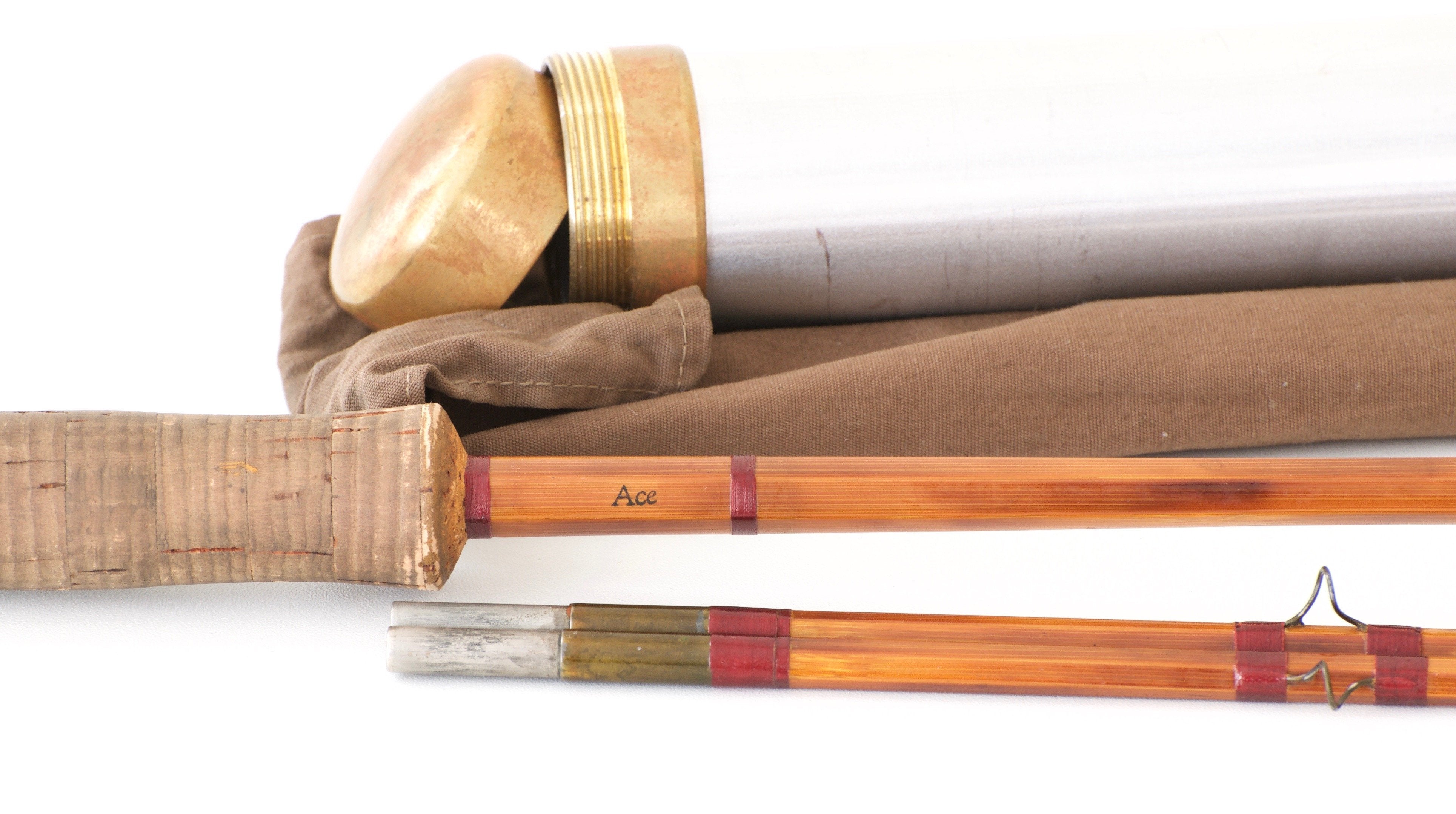 For sale here is a 9' 2/2 Paul Young Ace bamboo rod. Made entirely at the Young shop circa '48-'50, unlike most "Ace" and "Special" marked rods which were made with outsourced blanks. Rod is darkly flamed, showing a heavy resemblance to the named Parabolic series rods in appearance, a very uncommon feature for a model without hand written script. Features a smooth wells grip with cork reel seat spacer and screw down locking reel seat with "Paul H. Young Co - Detroit" die stamped aluminum butt cap. Ferrules are blued Pernack step-down type. Wraps are dark burgundy. Original tan bag with replacement brass capped tube. Rod weighs 5 3/4 oz and will handle a WF7 line with authority to amazing distances. The action is medium fast and the taper is progressive. All original, straight & right. Excellent condition.
