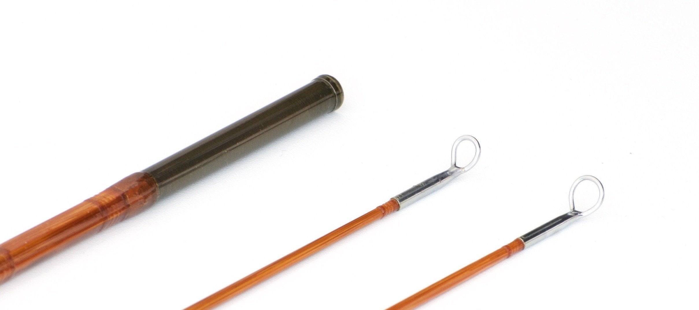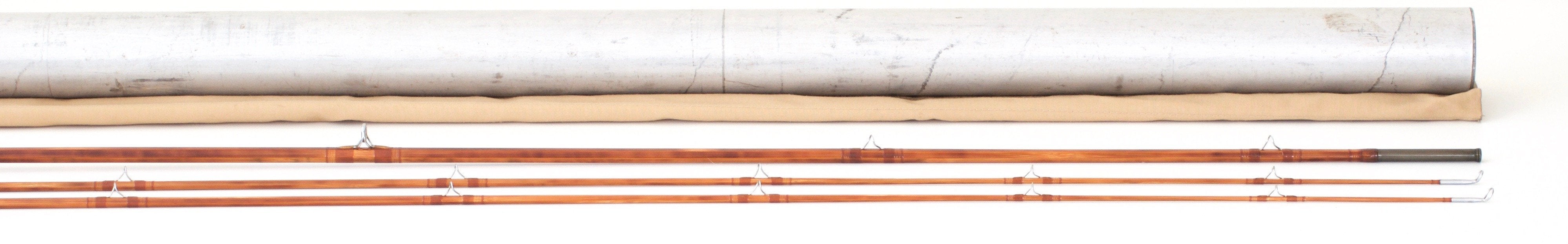 The blued nickel silver ferrules are size 16/64 with a nice and tight fit. The rod weighs 5.15 oz. The action is on the faster side of medium-fast and full of power, with a progressive taper rather than parabolic like most Young rods. It handles a DT6 or WF7 quite well. Strong enough to handle heavy winds, large poppers, weeds, and large aggressive fish - this rod is a cannon. The relatively light weight of the rod makes for easier casting and less fatigue. Includes replacement bag and original Champion tube with brass collar. Don't miss out on this great opportunity to acquire a possibly unique rod from the legendary Michigan rodmaker!