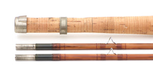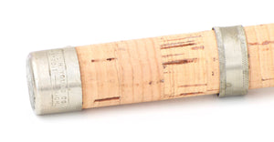 For sale here is a Paul H. Young / Don West "The General" Bug Action -- 8'6" 2/2 6-7wt. Made in 1950. The rod was made by Paul Young and finished out by Don West, a common arrangement with many PHY rods. Though labeled as "The General" the rod is similar to Young's "Texas General" model, just a bit lighter. The rod is in excellent restored condition. The restoration was performed by Bob Summers. Beautiful flamed cane with caramel colored wraps. Bright guides. The original script in West's handwriting remains clean and bold. Original cigar grip 6" in length with thumb indentation often seen on PHY rods. The cork is moderately soiled and with a small spot of filler. Nickel silver cap and ring reel seat over a mortised cork spacer. Paul H. Young seat hardware. Butt cap reads "Paul H. Young Co. Detroit - Mich".