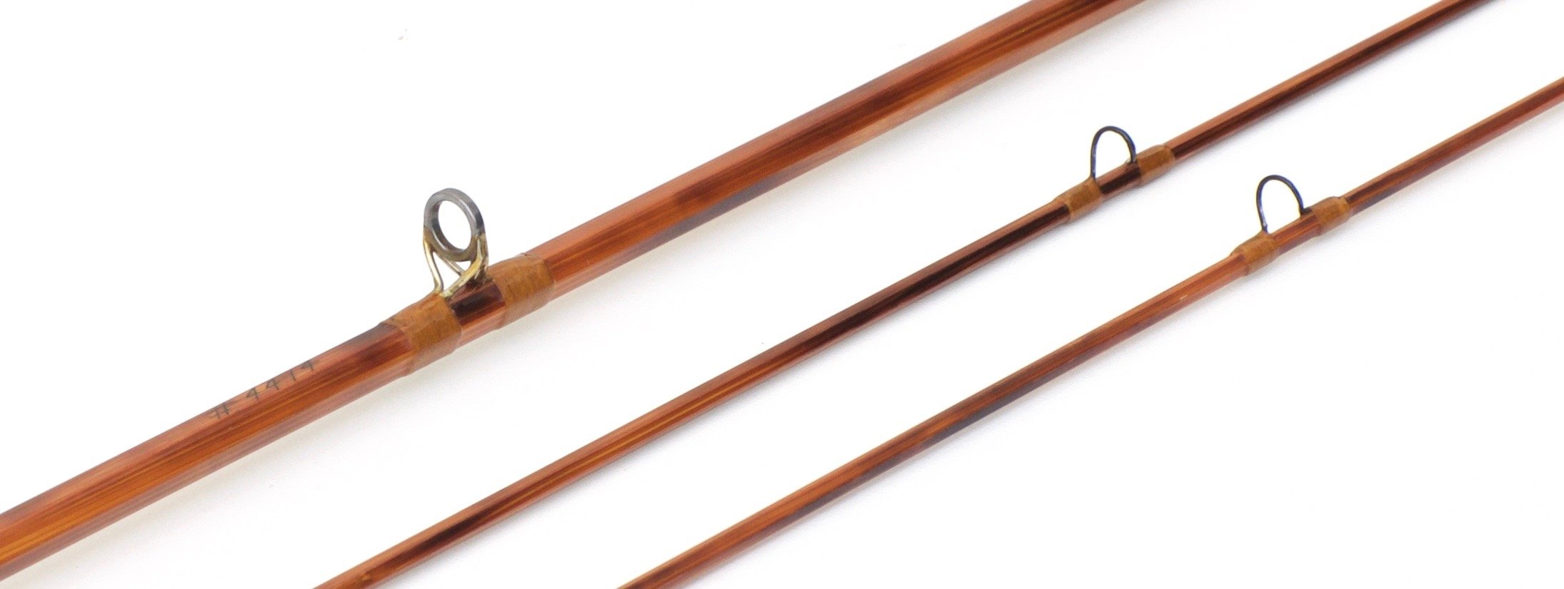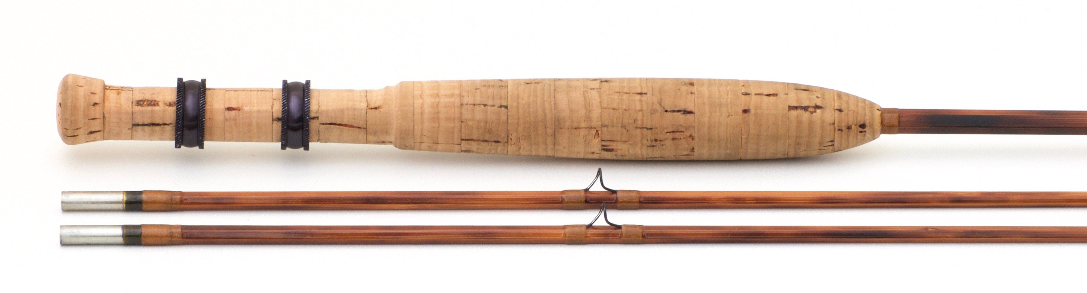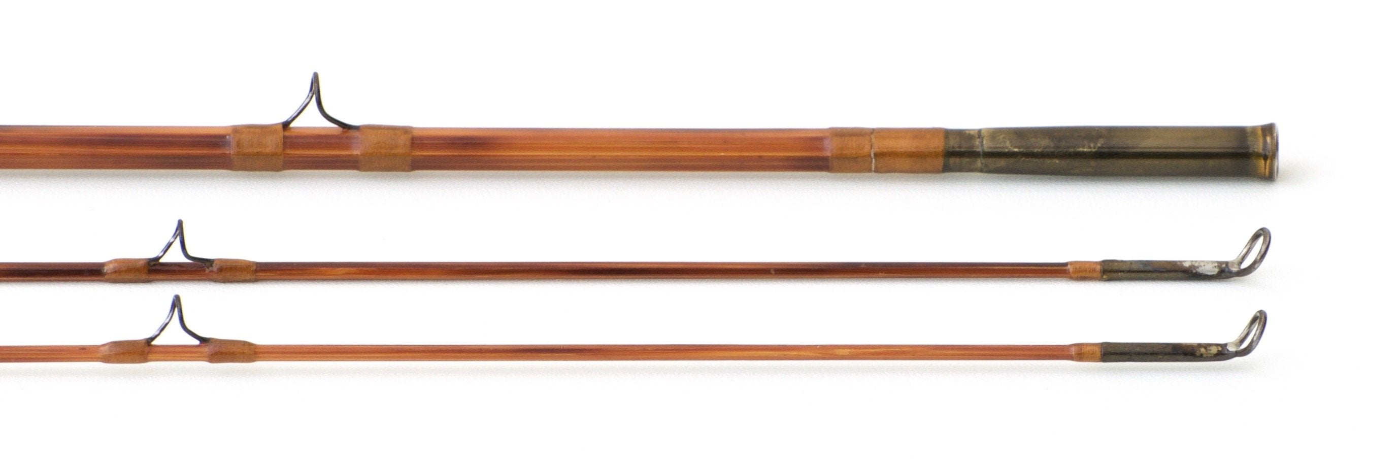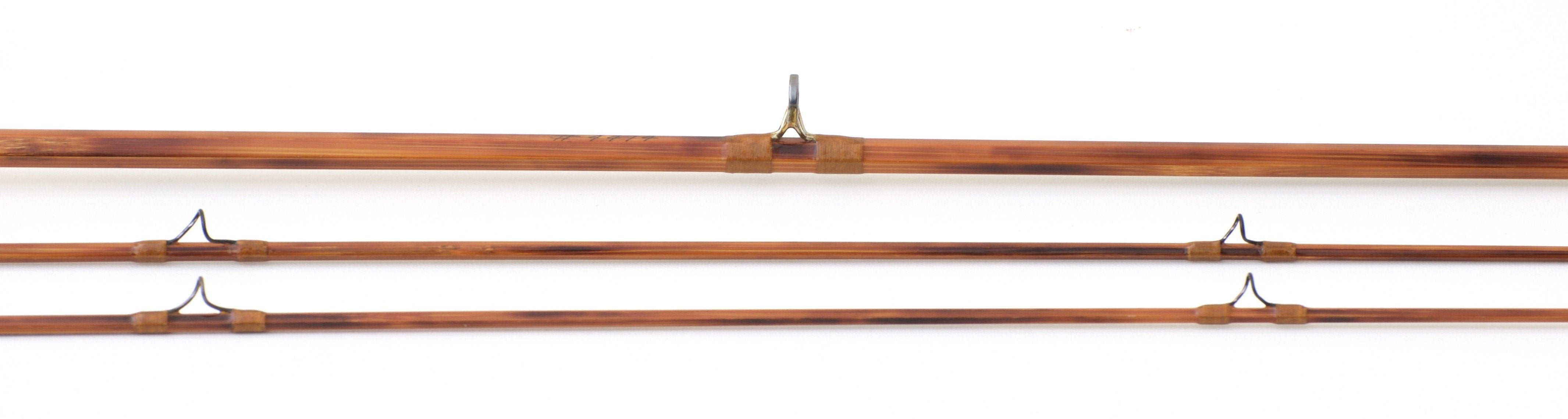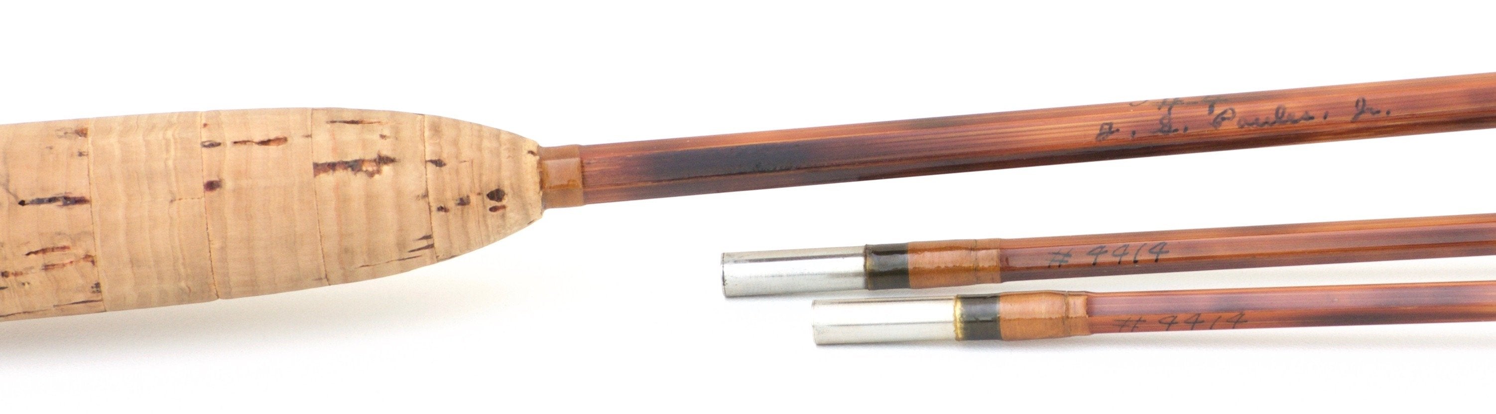 For sale here is a fine Paul H. Young "Midge" bamboo fly rod. 6'3" with two sections and two tips for a four weight line. Serial no. 4414 made in 1968 by Bob Summers. The rod is in excellent condition. All sections are full length and straight. Darkly mottle-flamed cane with bronze colored wraps. Oxidized guides. The script, in Summers' hand, remains clean and bold. It reads, "Midge 6'3" 1 3/4 oz." on one flat, with a "#4" below it, "A Paul H. Young Co. Rod" on another flat, and "J.G. Paules, Jr." on one flat. The PHY rod ledger confirms that this is the original person the rod was made for. Mr. Summers has since applied a very light protective overcoat of varnish to the cane and wraps. Petite cigar grip 5 1/4" in length with very light soiling. Dual black aluminum ring reel seat over a mortised cork spacer. Size 11/64 Super-Z ferrules with a perfect fit. The rod's actual weight is 2.10 oz. The action is parabolic and on the fast side of medium-fast. The original satin-like rod bag is in perfect condition, a rarity in itself as usually these satin bags deteriorated quite noticeably with moderate use and age. The original Champion-style tube is also in great condition.