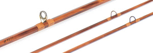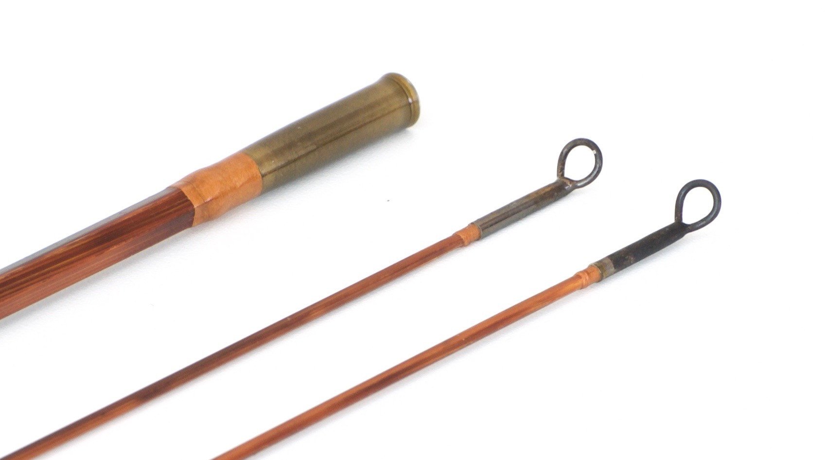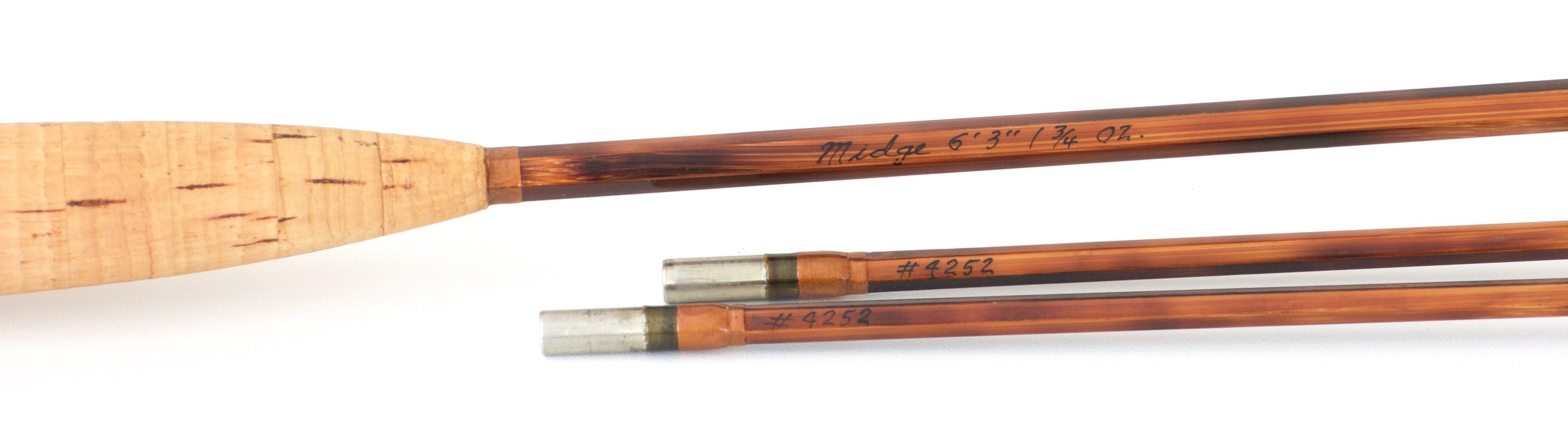 For sale here is a scarce Paul H. Young "Midge" bamboo fly rod. 6'3" with two sections and two tips for a four weight line. Serial no. 4252 made in 1966 by Bob Summers. The rod is in excellent plus and original condition. All sections are full length and straight. The rod is mottle-flamed with bronze colored wraps. Oxidized guides. The script remains clean and bold and reads "Midge 6'3" 1 3/4 oz." on one flat, and "A Paul H. Young Co. Rod" on another. Petite cigar grip 5 1/4" in length with very light soiling. Dual black aluminum ring reel seat over a mortised cork spacer. The rod features truncated swiss-style ferrules with an excellent fit. The rods actual weight is 2.05 oz. The action is parabolic and on the fast side of medium-fast. The original satin-like rod bag is in perfect condition, a rarity in itself as usually these satin bags deteriorated quite noticeably with moderate use and age. The original Champion-style tube in great condition also.