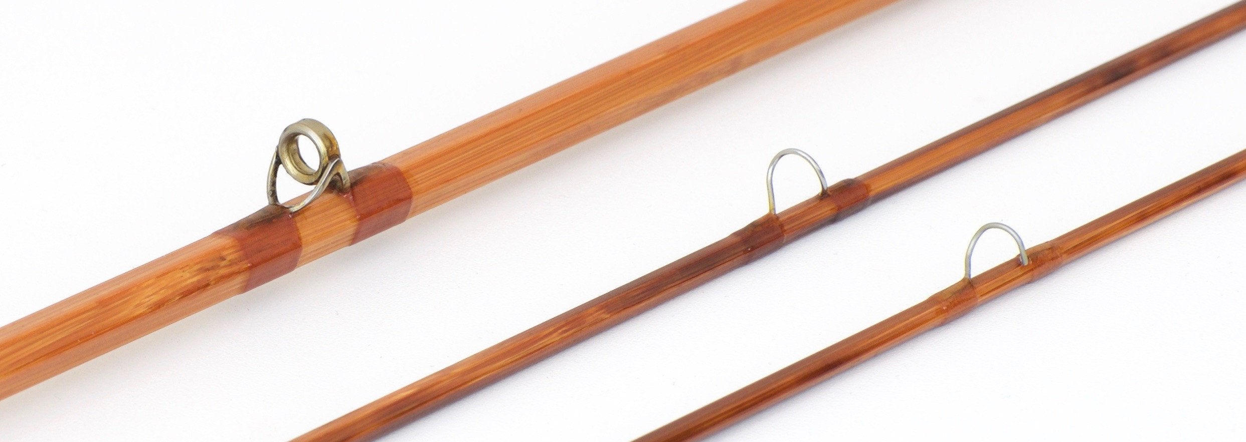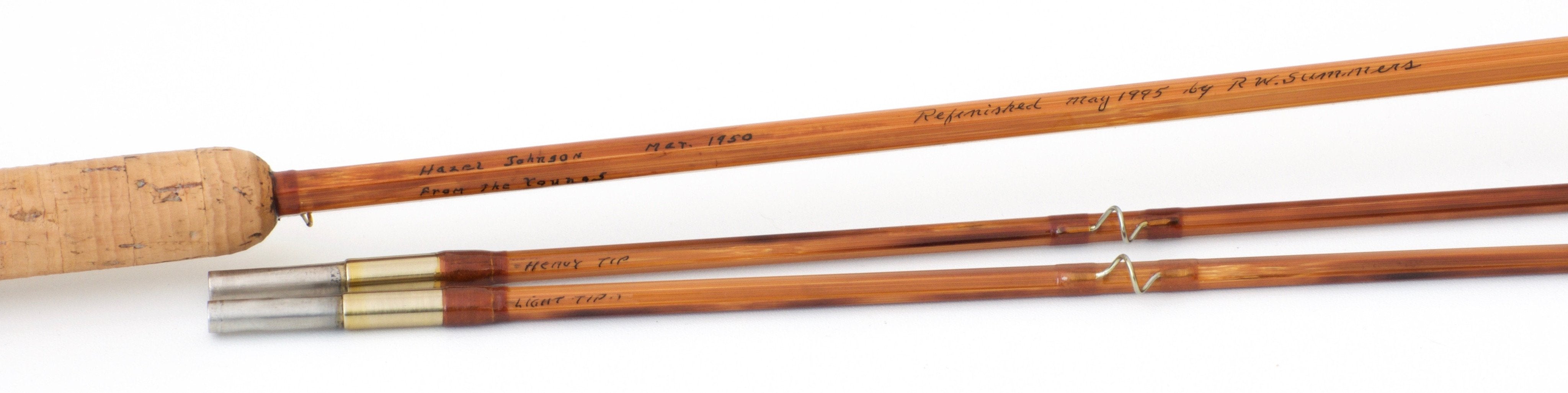 For sale here is a Paul H. Young Parabolic 15 bamboo rod. The rod was built for Hazel Johnson by Paul Young in 1950 and is not serial numbered. Hazel Johnson tied flies for the Paul H. Young Rod Co. for ~ 30 years (and also performed the role of babysitter for Paul Jr. and Jack!) Hazel's son also told me that the great Ted Williams would come in the PHY Rod Co. shop and watch Hazel tie flies. This rod came directly from the Johnson family. Mr. Young rarely inked "From The Youngs" on his rods and only did so for very special friends. The rod is in near mint restored condition. Bob Summers restored the rod in 1995 and it doesn't appear to have been used since then. The step-down size 15/64 ferrule fit is perfect. All cork reel seat with nickel silver stamped cap and ring. The rod weighs 3 3/4 oz. The overall length is 7 feet 11 inches, likely how it came out of the Young shop. Original bag and tube. A very sought-after rod model from one of the best, complete with a provenance letter from the Johnson family.