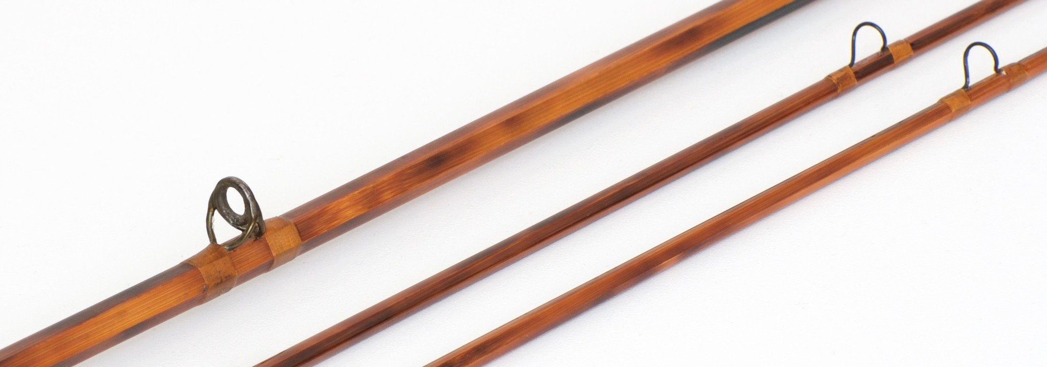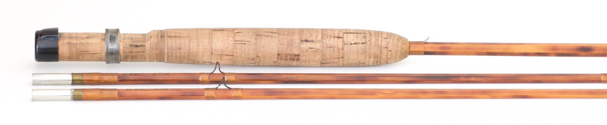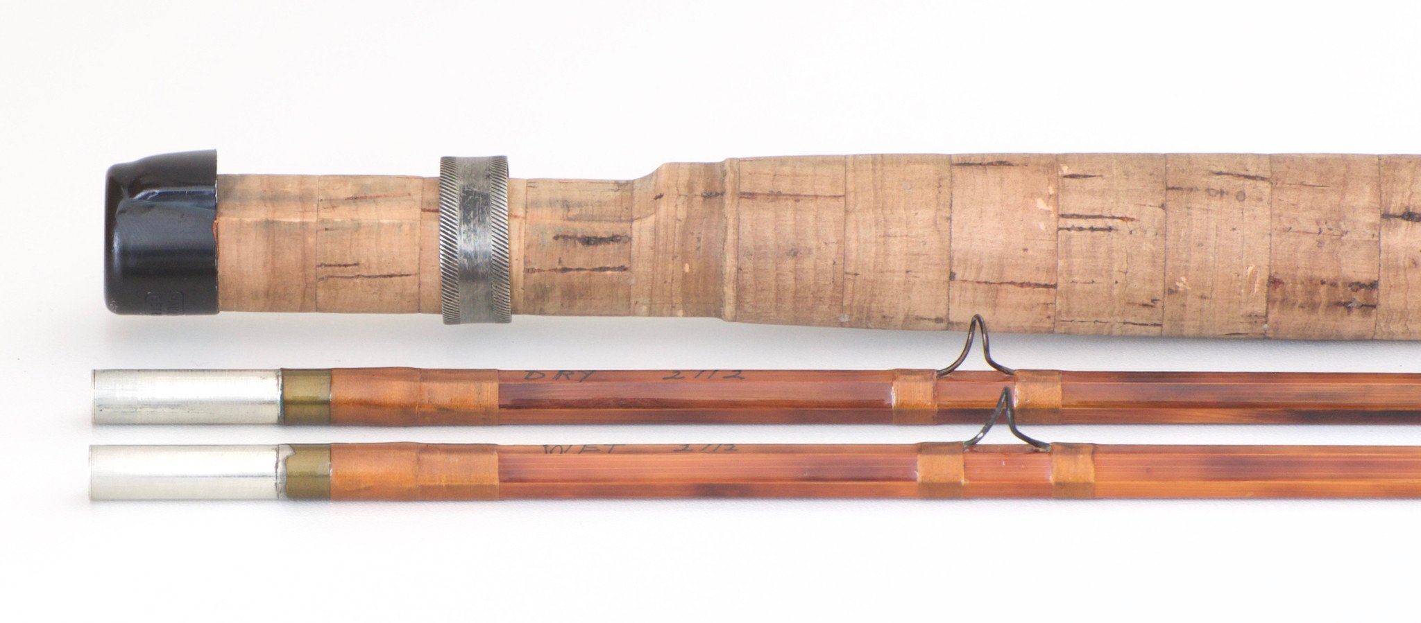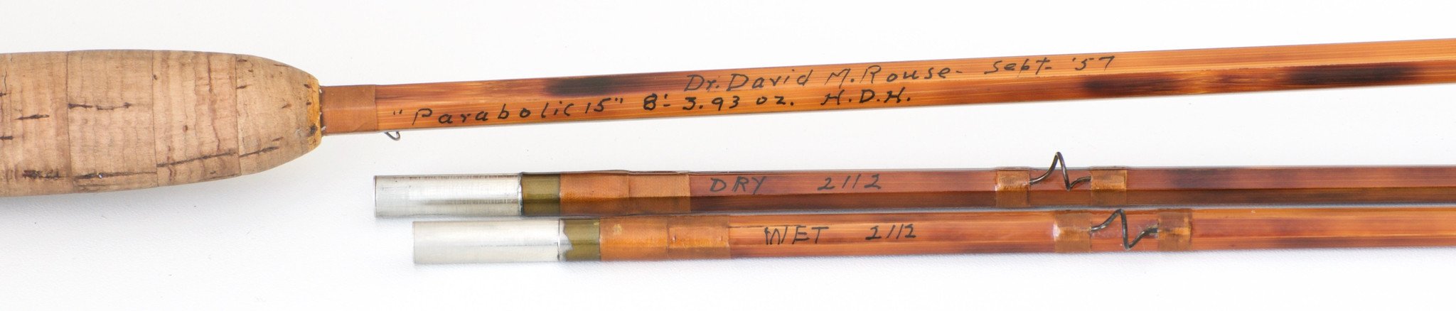 For sale here is a classic and stunning Paul Young Parabolic 15 -- 8’ 2/2 weighing 3.93 oz. Made in Sept. 1957. All script on rod is in Paul Young’s hand. The heavier tip is marked “WET” and other is marked “DRY”. Both tips are serial numbered 2112 as is the butt section. Casts a DT5 or WF6 with authority. The cigar grip has been left uncleaned and is free of ridging. The reel seat is a mortised cork spacer with slide band and black aluminum butt cap stamped Paul H. Young Co. Detroit-Mich. Bent wire style hook keeper. Ferrules are excellent fitting, stamped Super Z, and are oxidized. Wraps are Young’s standard tan with spiral accents at ferrules. Original copper color bag and original Champion tube. Rod is straight with no repairs and none are needed; everything is correct and as it should be. Varnish surface shows minor signs of use/age.Overall, I would rate condition as excellent- original. Original Paul Young made rods in this condition are extremely difficult to find these days.