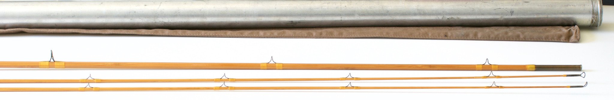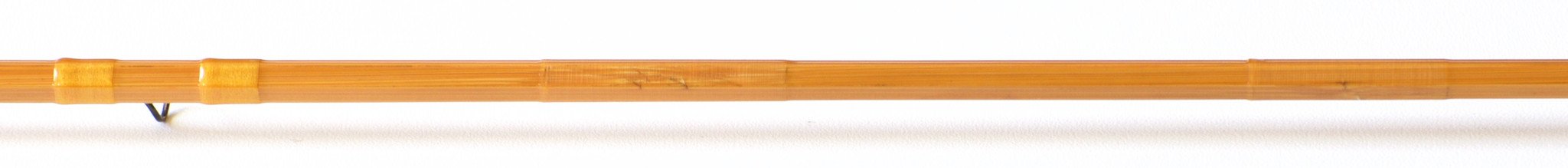 For sale here is a scarce Paul H. Young Para 16 bamboo rod. The rod is in excellent restored condition. There is an invisible repair wrap on one tip under the first guide down from the tip-top. Also there are two invisible lift wraps on this tip between the 6th and 7th guides from the tip-top. The one furthest up is 1" and the one closer to the ferrule is 1 1/4". One small chip in the varnish exists below the "Y" in the script. All of the restoration work was performed by Glenn Brackett while at R.L. Winston. The second tip has no repairs. Nickel silver cap and down-locking ring over cork. Reverse half wells grip. Slight ridging in the cork. Golden silks compliment the cane in an understated way. Brackett's handwriting appears on 4 flats. First flat: "The Paul H. Young Rod Co.". Second flat: " 'Para 16' ". Third flat: "8 1/2' - 4.375 oz". Fourth flat: "H.C.H or H.C.F". The ferrule size is 16/64 and the fit is excellent. Medium-fast parabolic action. As stated in the script, for a 7 weight line. The rod weighs 4 7/8 oz.