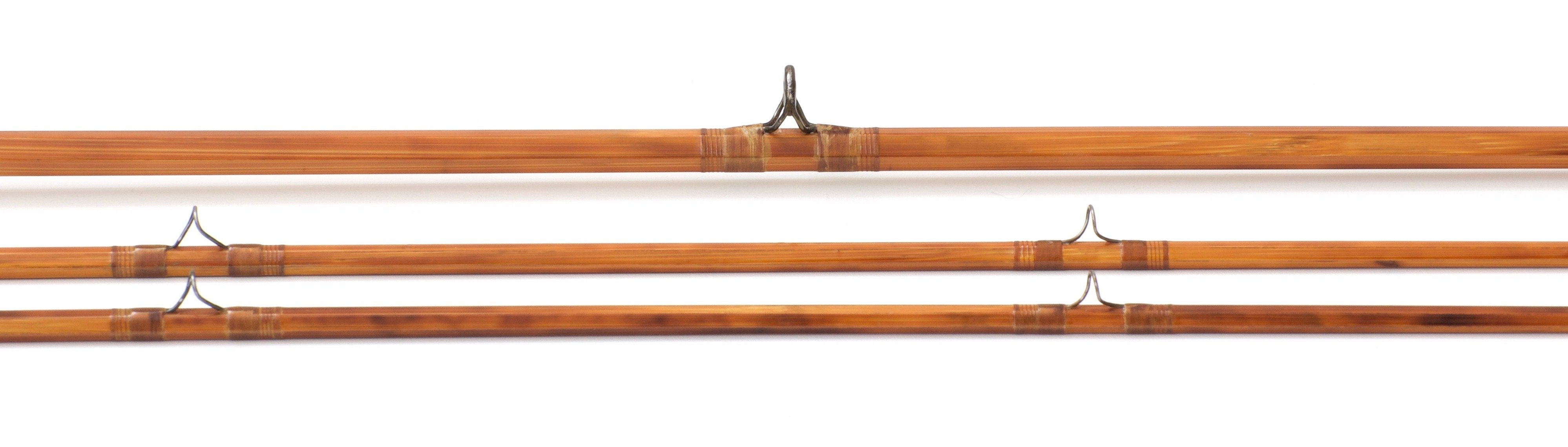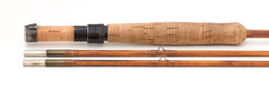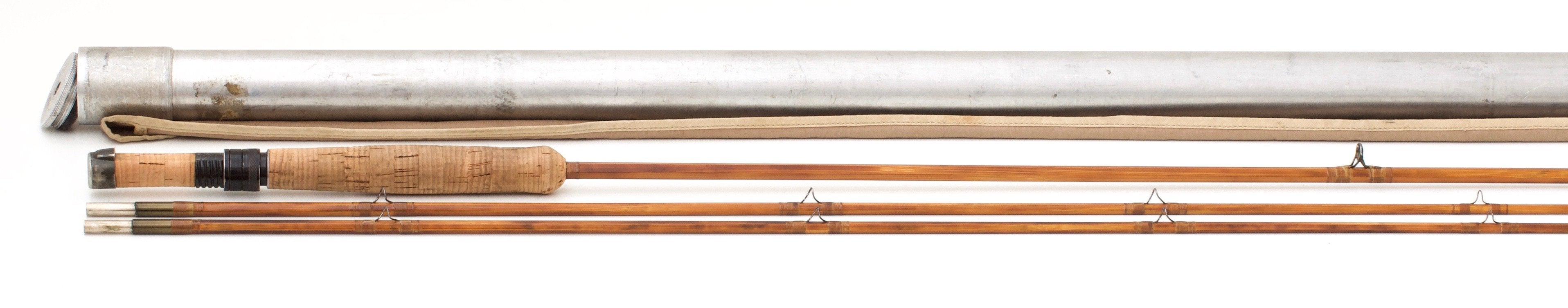 Both tips are the same taper. Modified wells cigar grip with mortised cork reel seat spacer and black aluminum down locking seat with Paul H. Young Detroit stamped butt cap. Super fitting ferrules are size 17 blued Pernack step-down type. Deluxe grade brown wraps with spiral accents at each guide, ferrules, grip (6' length), and tip-tops. Original tan bag and B-24 tube. Color preserver has caused some lightening on the butt guide wraps but all are sound with an attractive patina.
