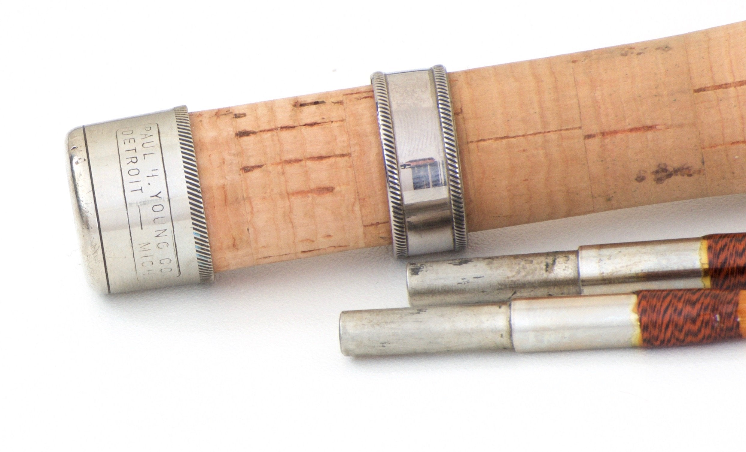 For sale here we have an early Paul H. Young Prosperity 7'6" 2/2 5wt bamboo fly rod.The rod was beautifully restored by Tim Zietak and remains in excellent condition with the only issue being a slight set in one of the tips. The rod features variegated rust and black silks. The original "Prosperity" stamp was retained on the butt section. Modified wells grip with only light soiling. Nickel silver cap and ring reel seat over a mortised cork spacer. The ferrule fit is excellent. The rod weighs 3.65 oz. Medium fast action. Includes original green bag with replacement tube.