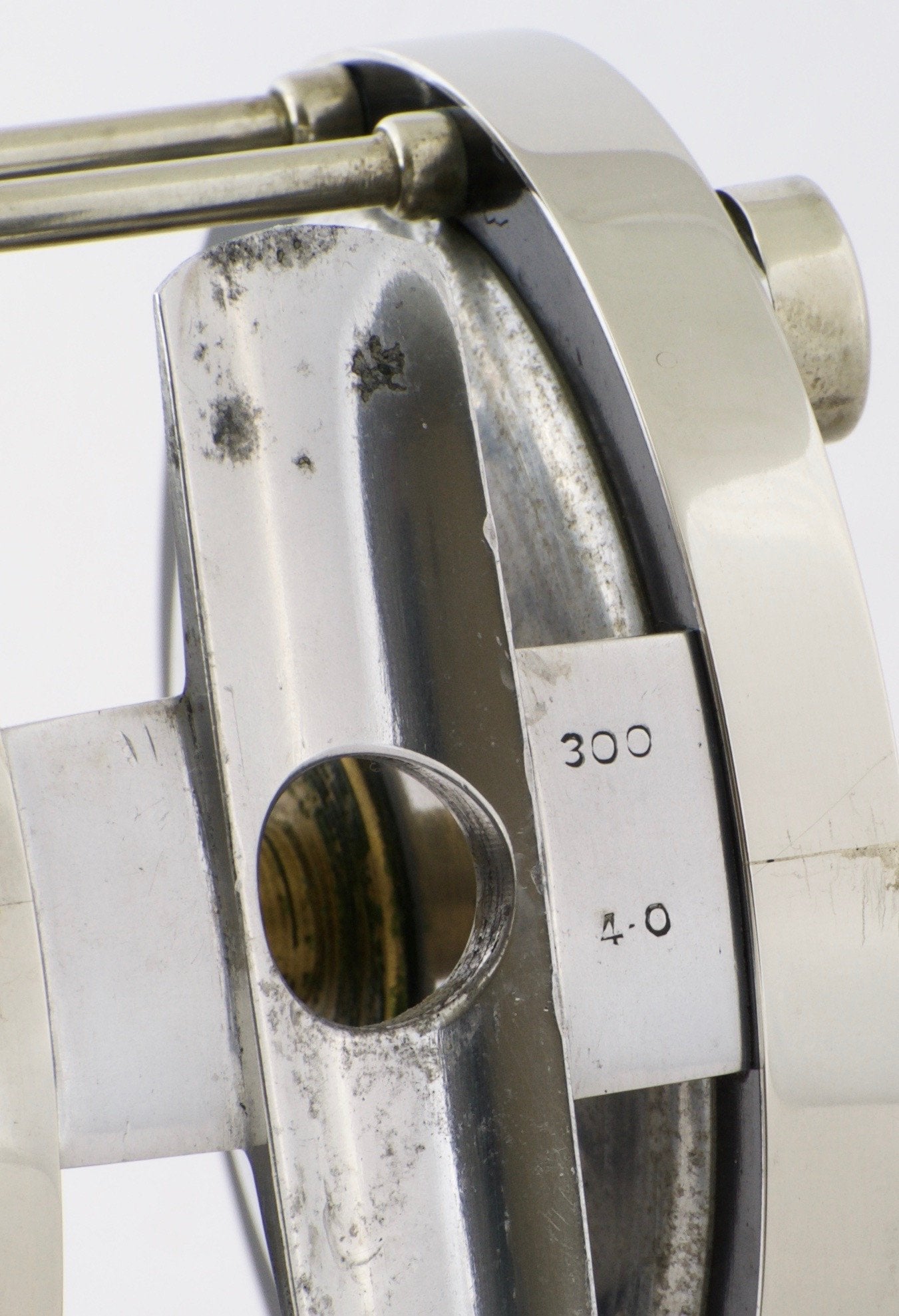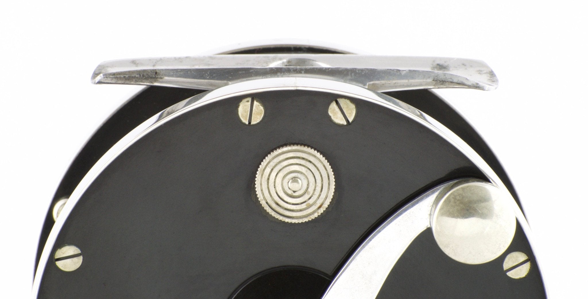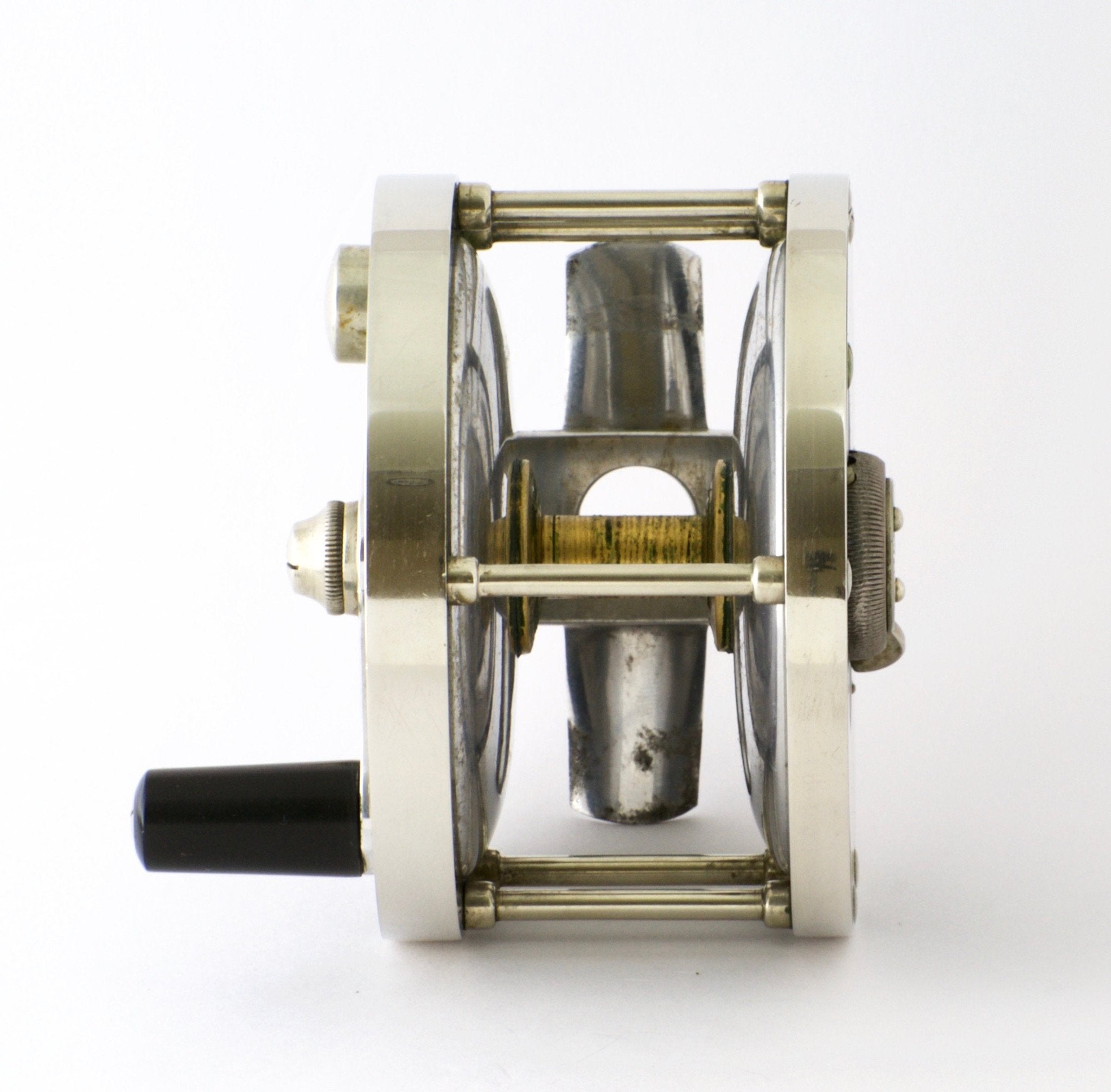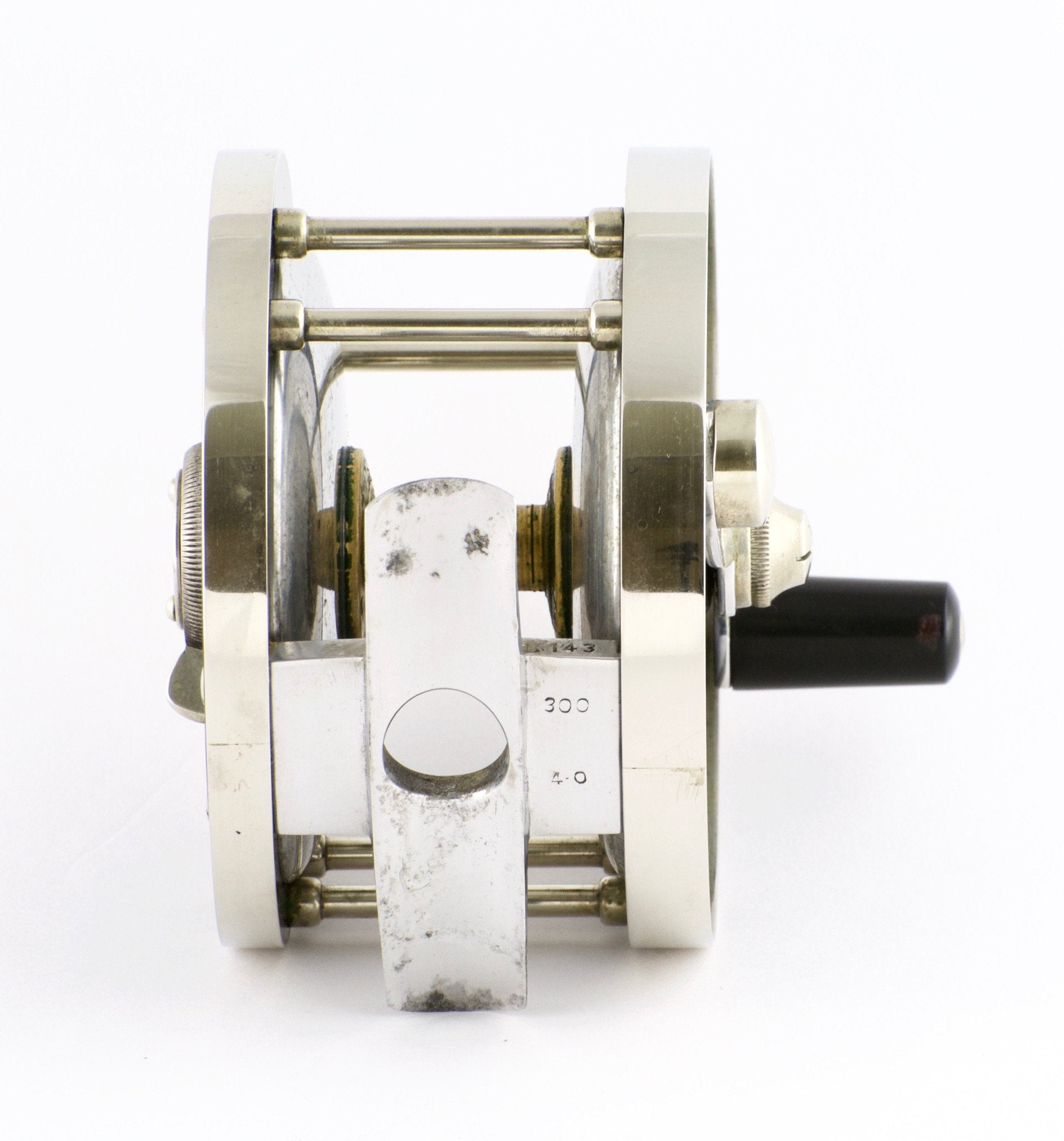 For sale here is a very scarce Otto Zwarg Model 300 Saguenay salmon fly reel - size 4/0. Single action. Made in Brooklyn. Serial number B143 made in 1947. Excellent++ condition. The drag is still perfectly strong and smooth. The reel has its full length original foot with a little bend on one corner. The screws show absolutely NO use marks. The reel's rims, pillars, and spool have been gently polished. The reel was found in an ammunition container in a storage locker and had been there for approximately thirty years untouched. It had developed some verdigris on the german silver rims and the spool had an old silk line on it that had become sticky. The line residue was cleaned off of the spool and shows absolutely no corrosion. The rims and pillars were polished and look stunning! The ebonite sideplates have not been polished in any manner, remaining unharmed and retaining their rich black color.