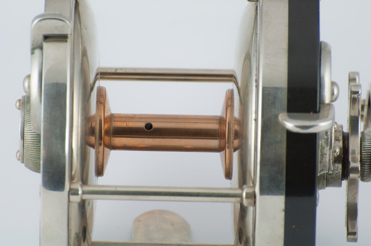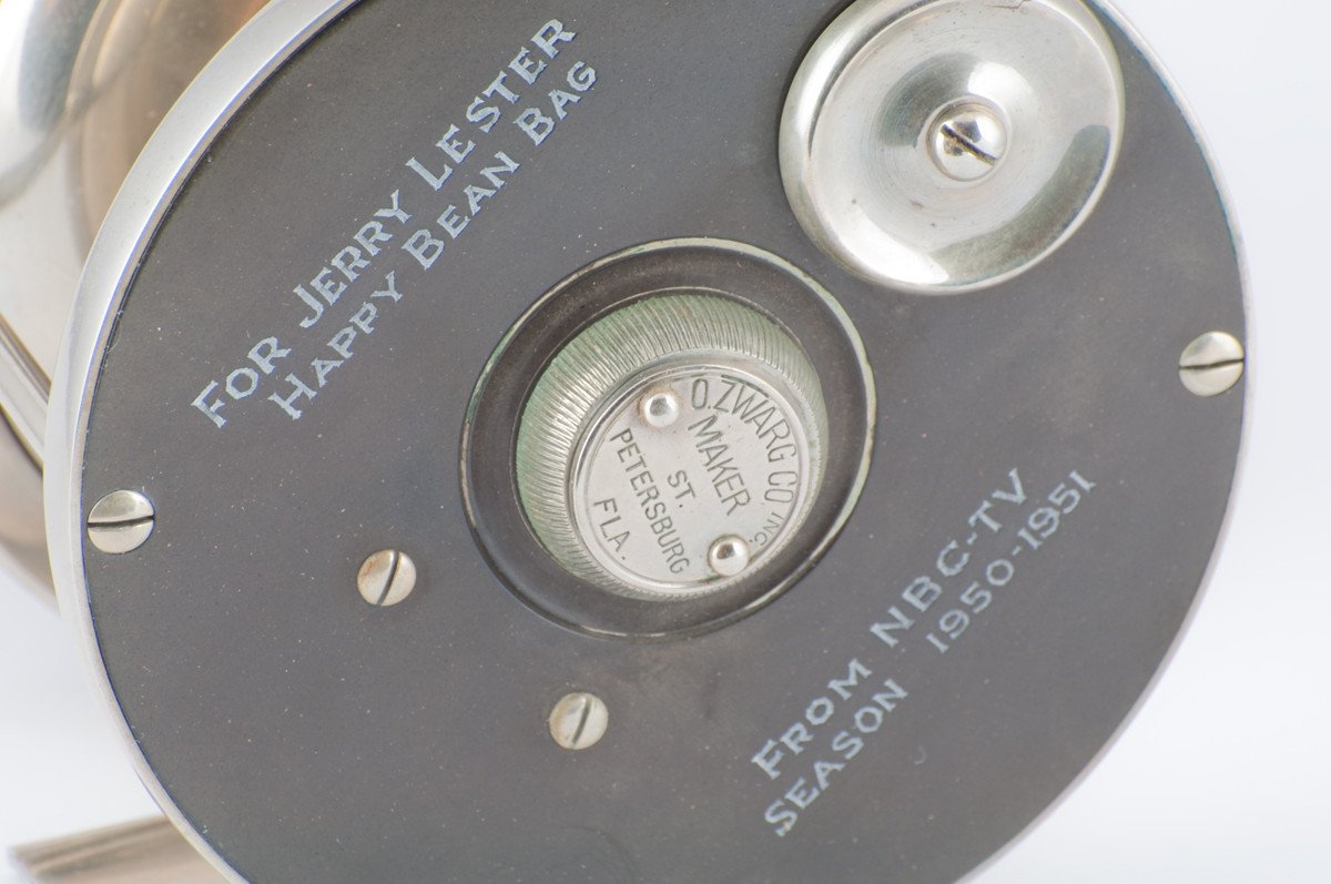 For sale here is a Otto Zwarg Model 600 reel - size 4/0. (St. Petersburg). What makes this reel unique is the history behind it. The reel was gifted to NBC TV personality Jerry Lester, star of the late night TV show "Broadway Open House", the forerunner of "The Tonight Show". The reel is in excellent condition with only a few hairline scratches in the ebonite plates. No chips or cracks in the reel. Also included is the original leather case with Lester's initials, "JL". The case is in excellent condition as well. The Zwarg catalog I have notes the capacity as "300 yards No. 15 or 200 yards No. 21 Linen Line". Reel diameter is 3 7/8" and the spool width is 2 1/8". The reel weighs 31 ounces.